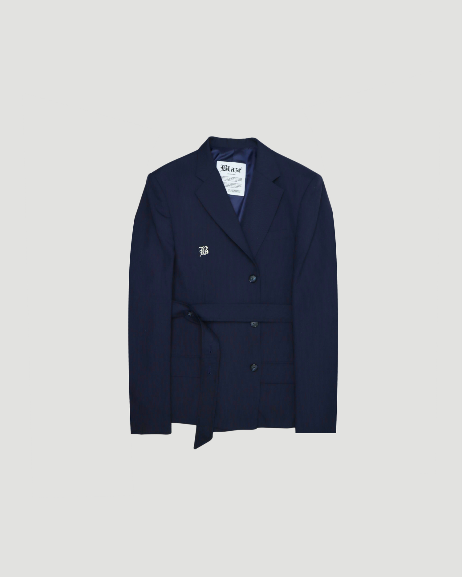 Tailored blazer featuring a belt made from the same fabric. The belt can be tied at the front or back for flexible styling and a strong silhouette.