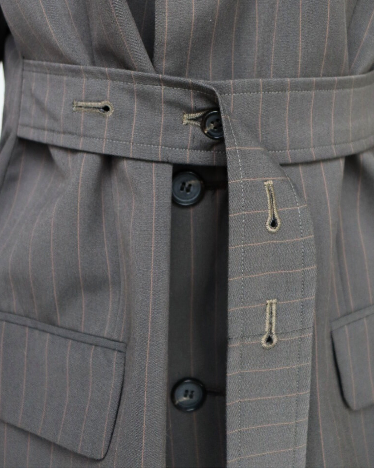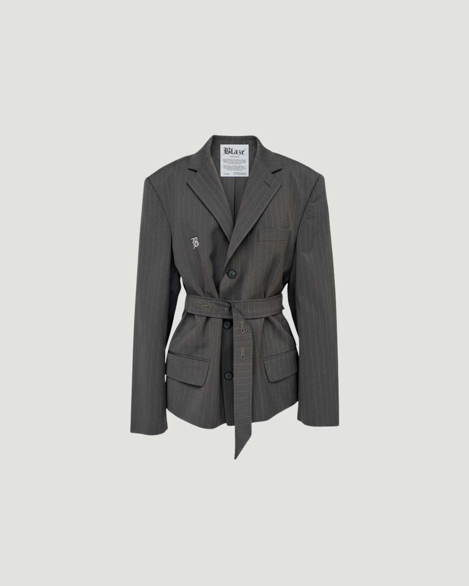 Tailored blazer featuring a belt made from the same fabric. The belt can be tied at the front or back for flexible styling and a strong silhouette.