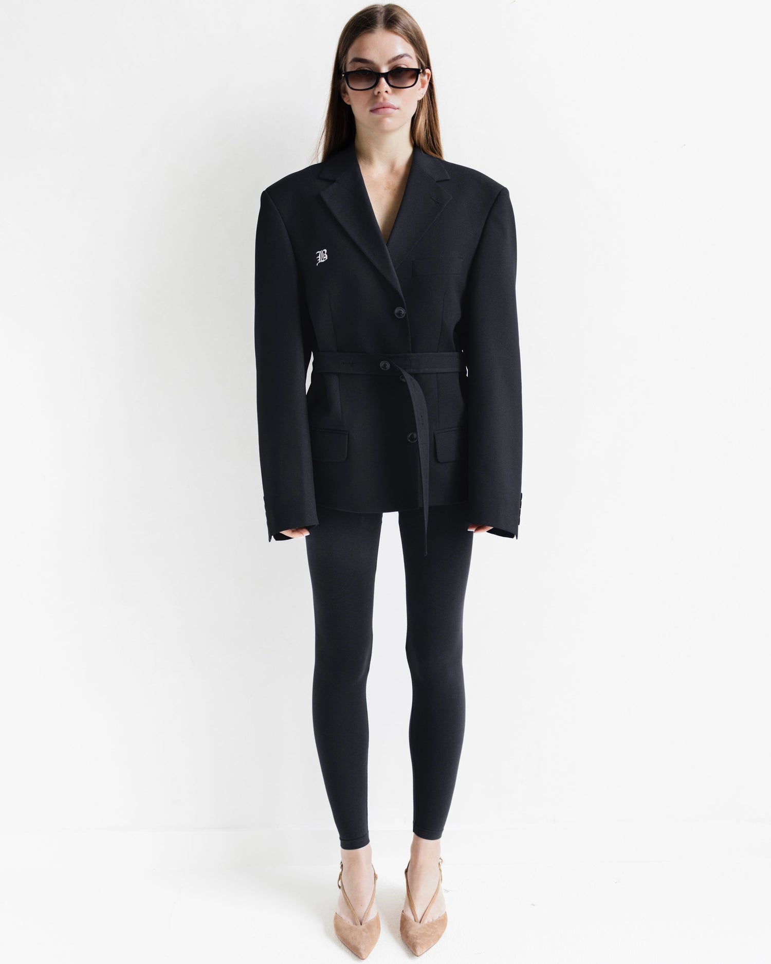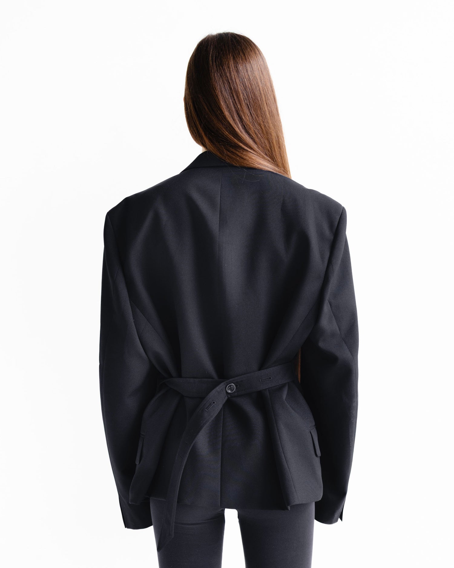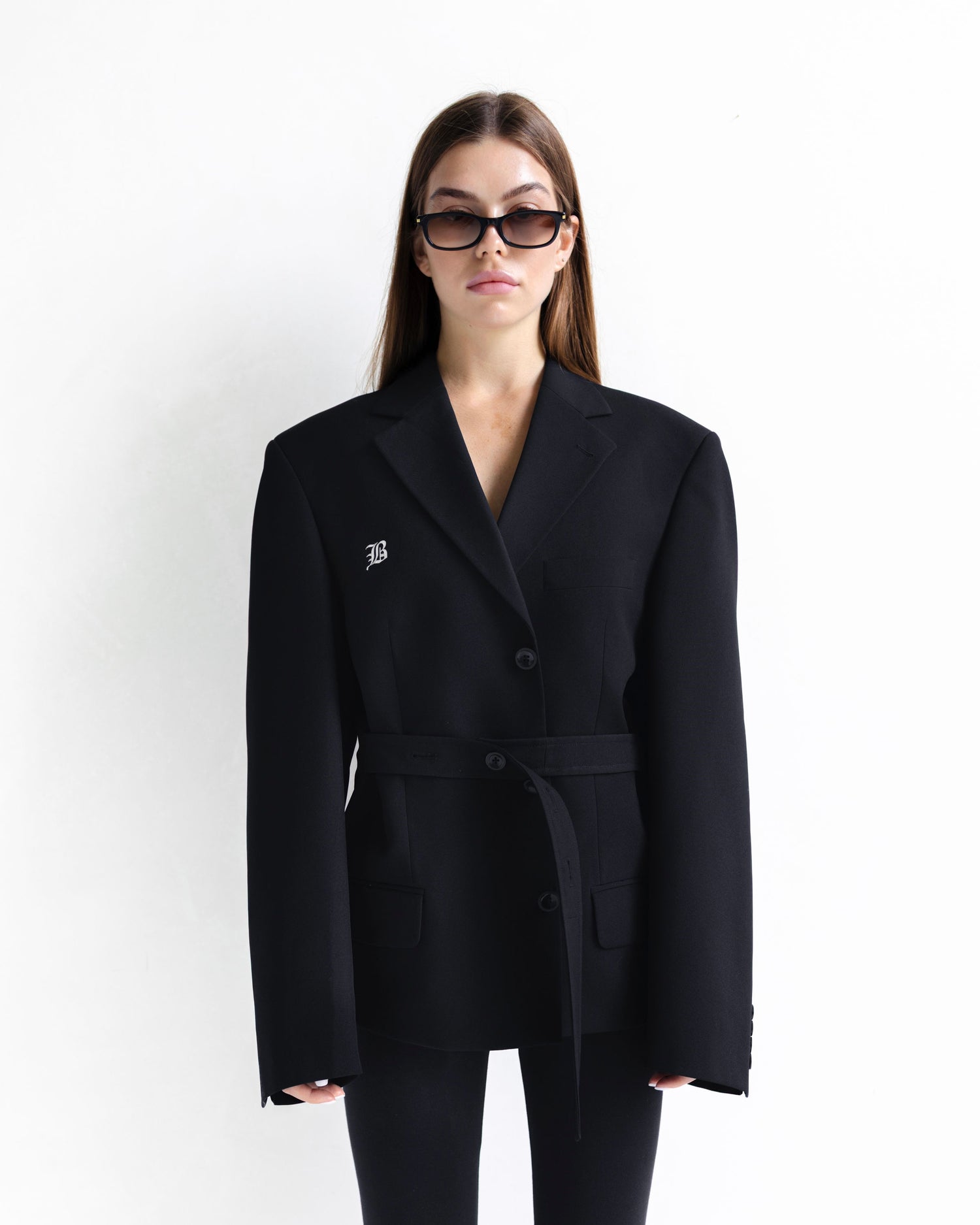 Tailored blazer featuring a belt made from the same fabric. The belt can be tied at the front or back for flexible styling and a strong silhouette.