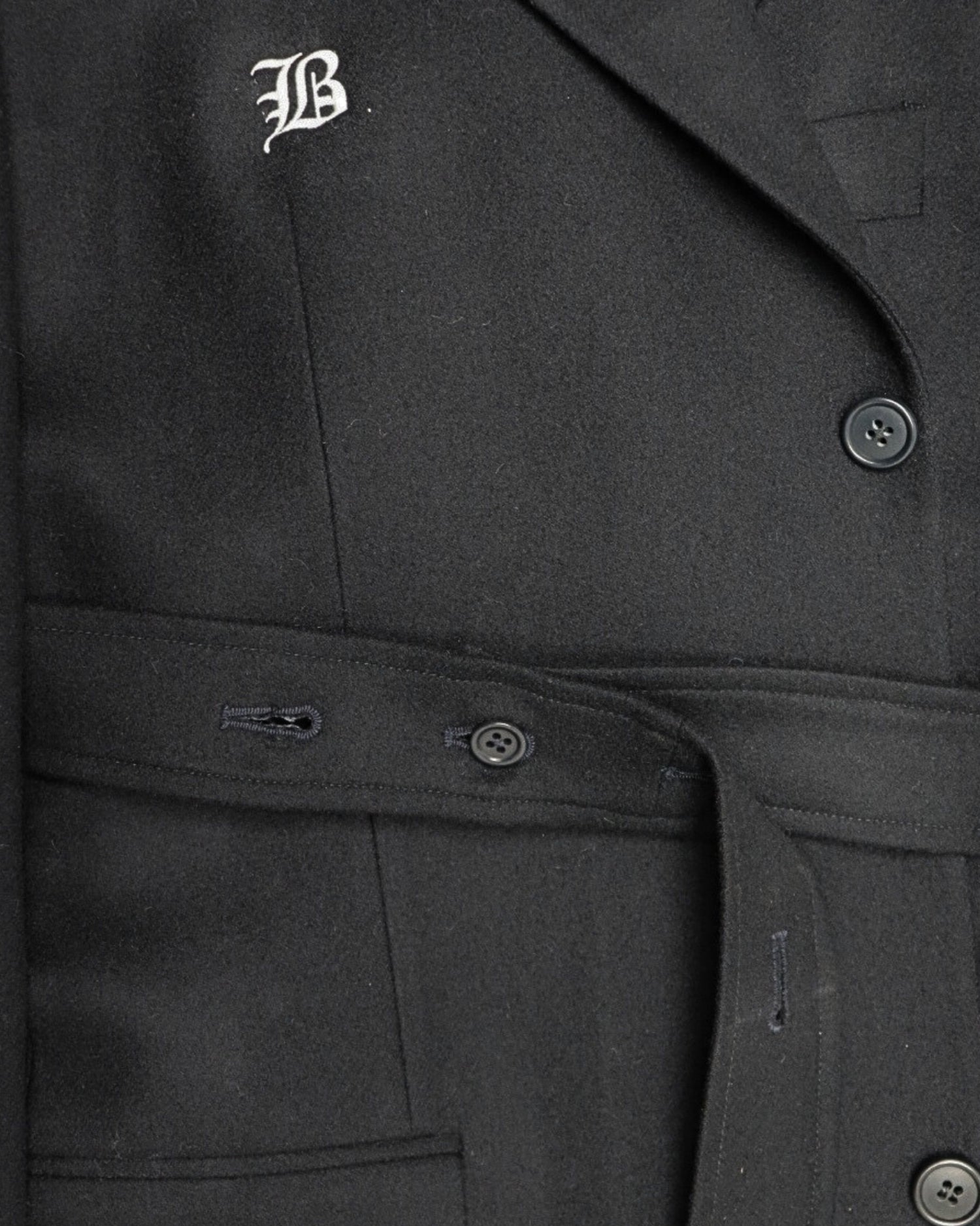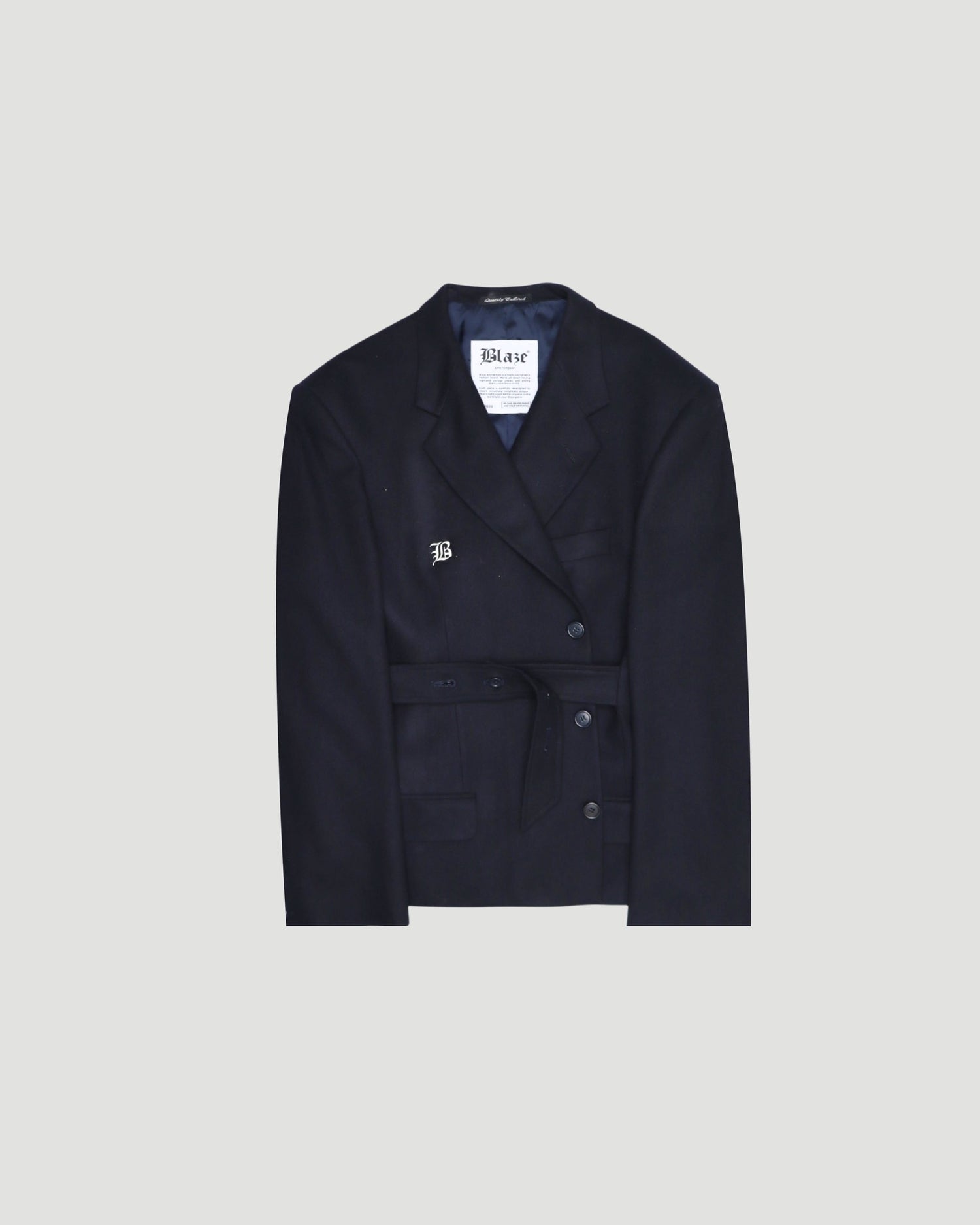 Tailored blazer featuring a belt made from the same fabric. The belt can be tied at the front or back for flexible styling and a strong silhouette.