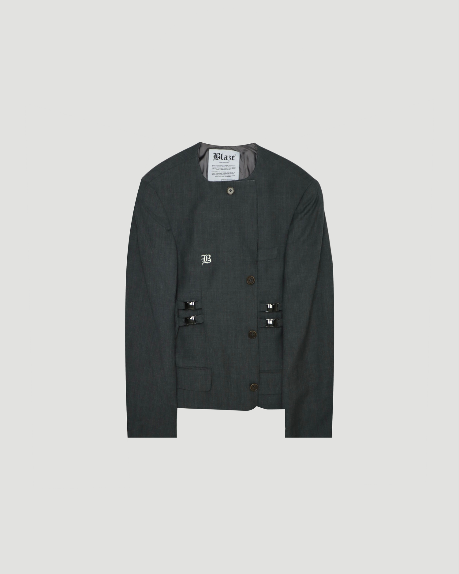 Built on the same silhouette as the Cinch Blaze, this version is cinched at the waist using delicate buckles. The removal of the collar and clean front button give it that same refined shape.