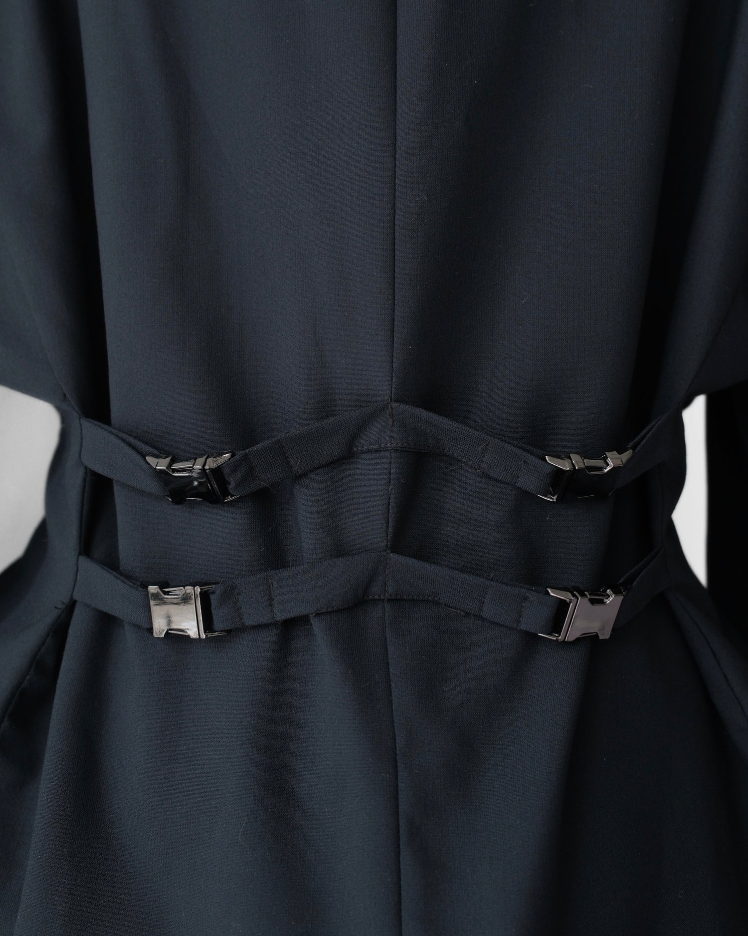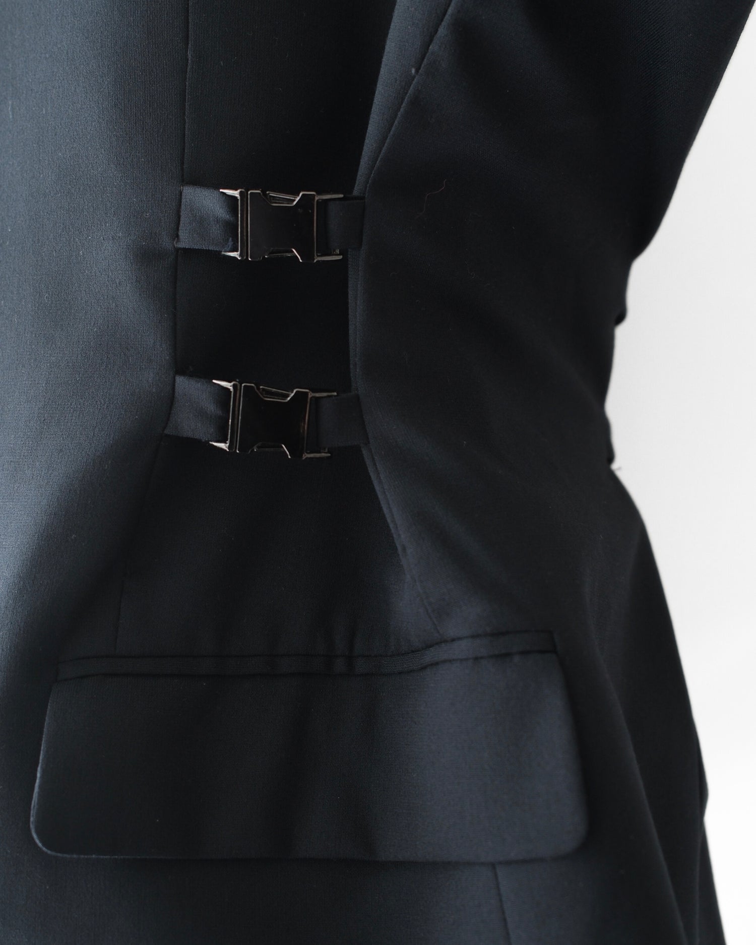 Built on the same silhouette as the Cinch Blaze, this version is cinched at the waist using delicate buckles. The removal of the collar and clean front button give it that same refined shape.
