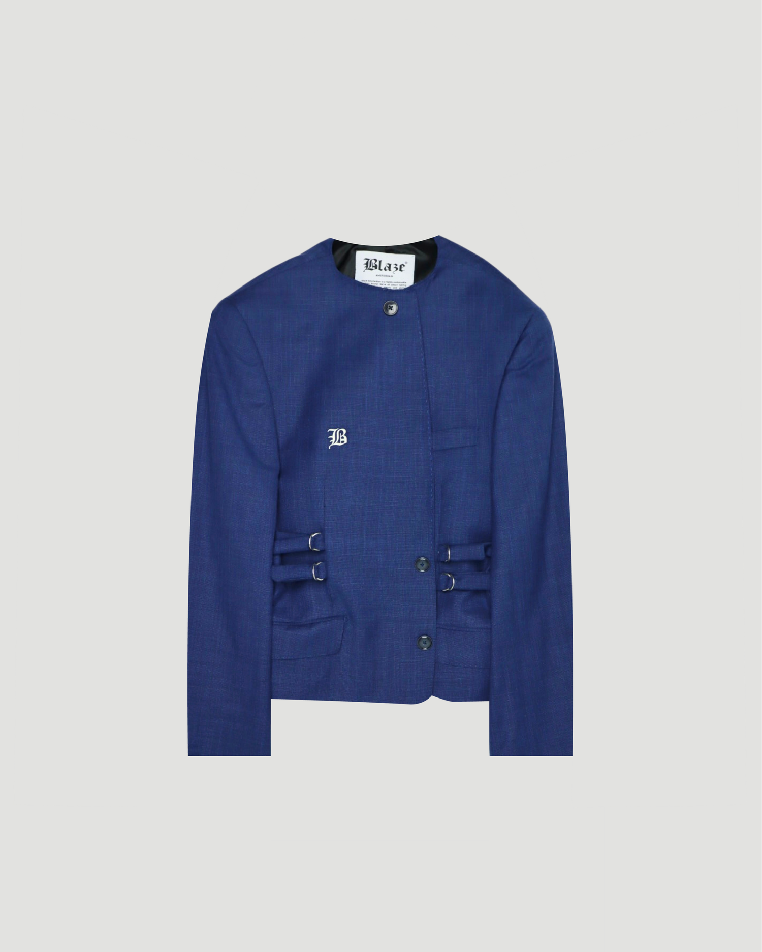 A refined silhouette tailored with rings at the waist, but more than just fitted, this blazer has been reimagined entirely. With the collar removed and a single front button added, it takes on a classic, almost vintage shape.