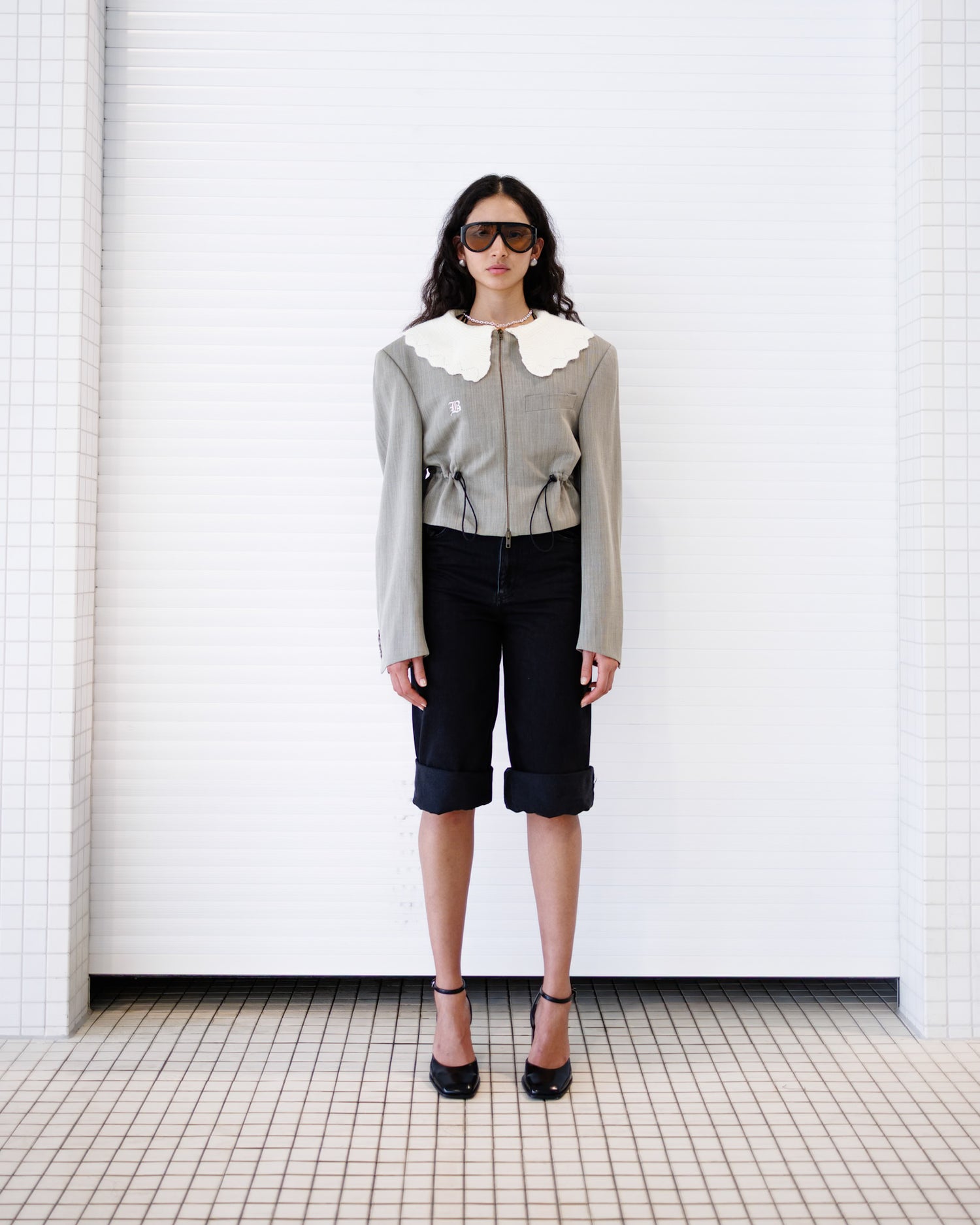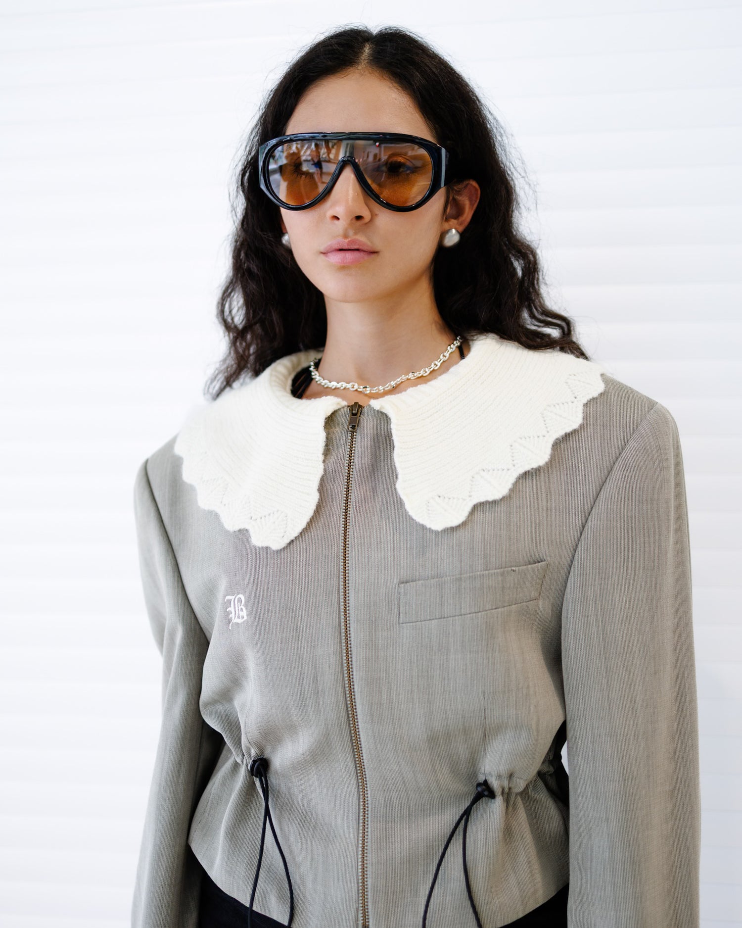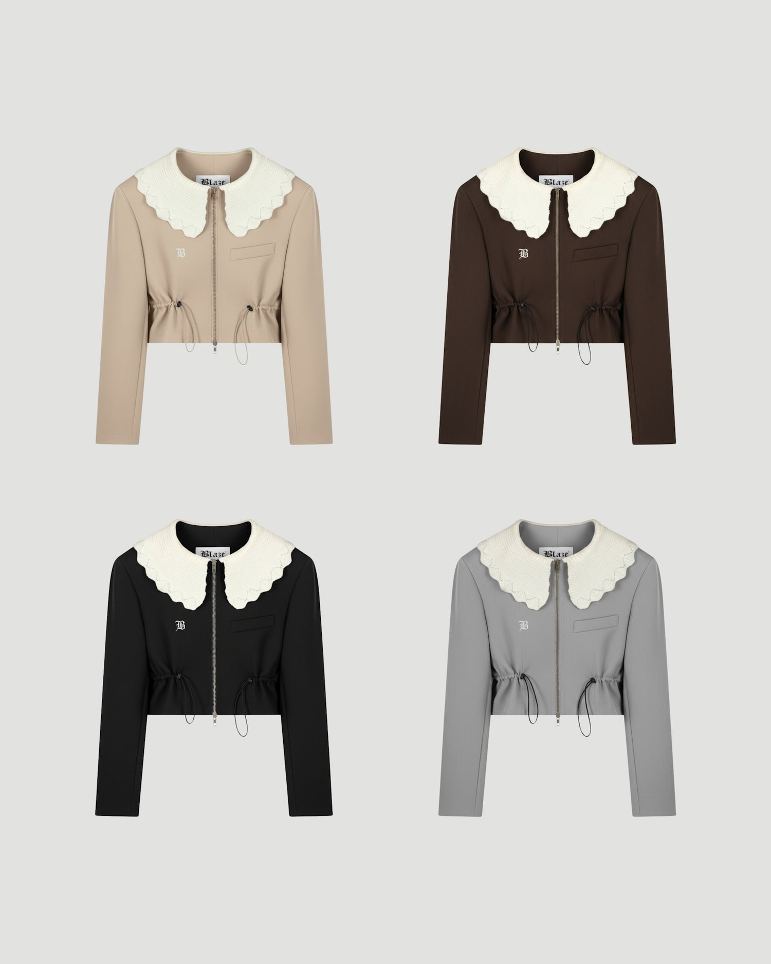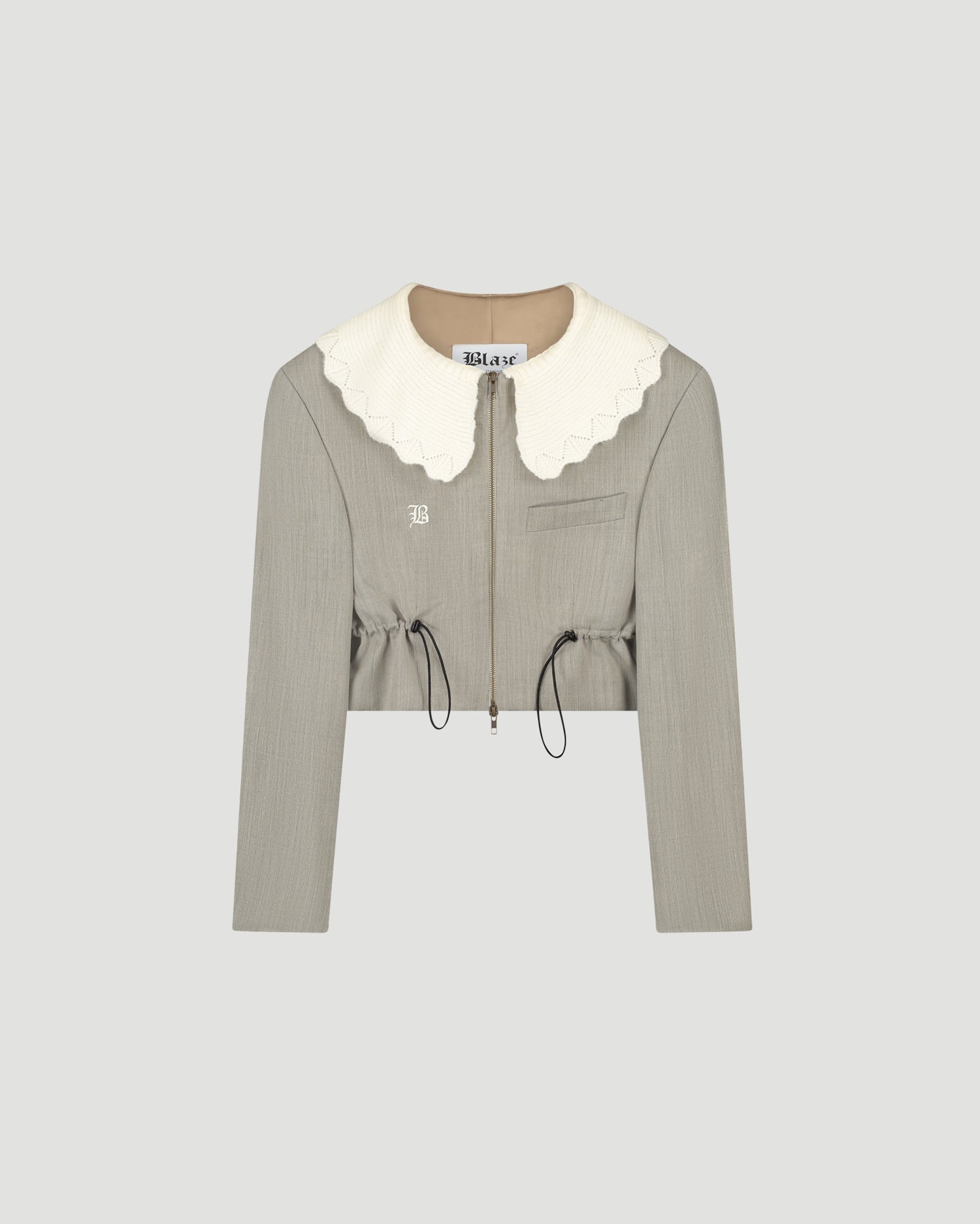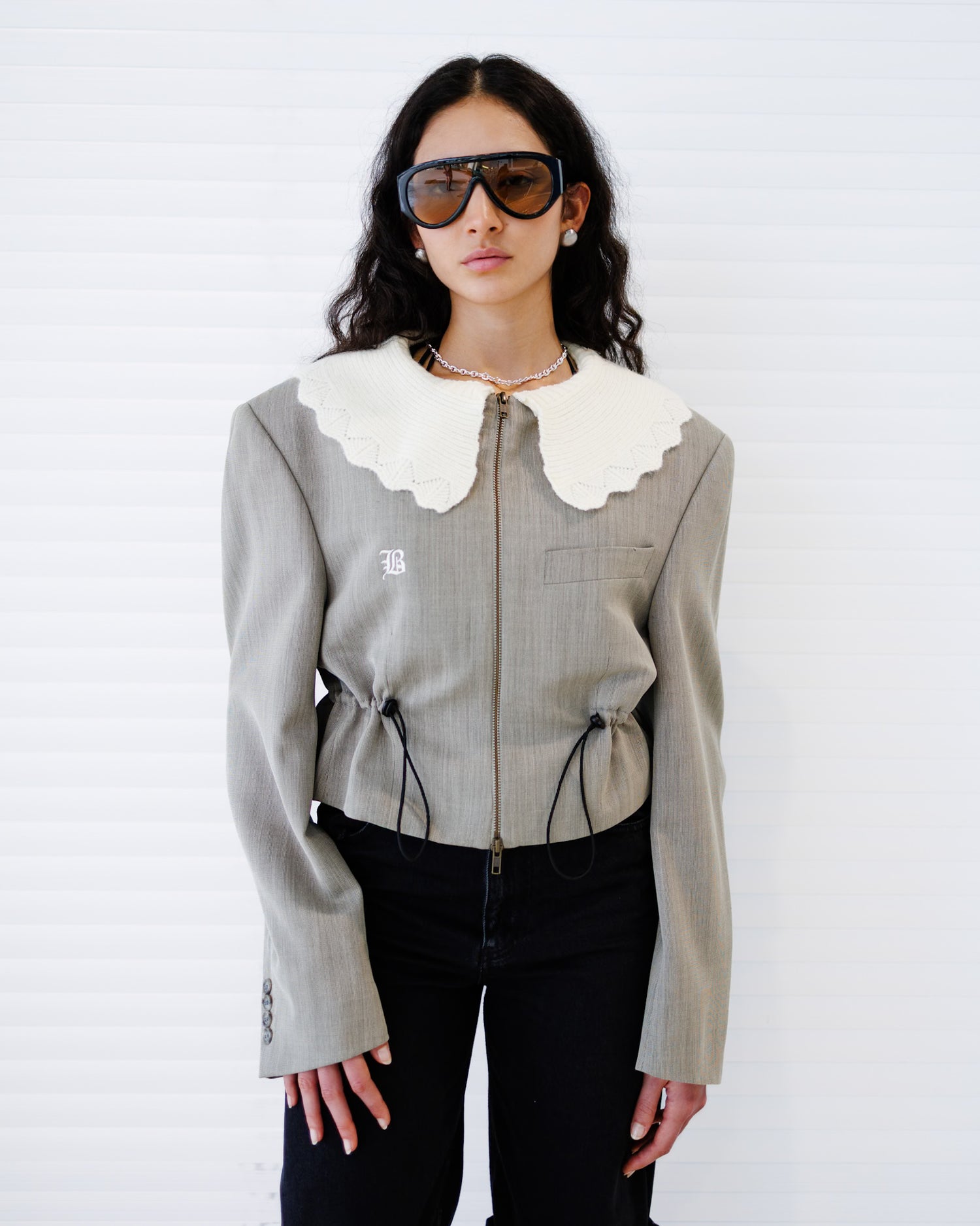 The Crochet Blaze is cinched beautifully at the waist with a smooth zipper closure, creating a sculpted silhouette. Its standout feature is a delicately crocheted collar, adding warmth, softness, and a handmade touch to a modern shape.