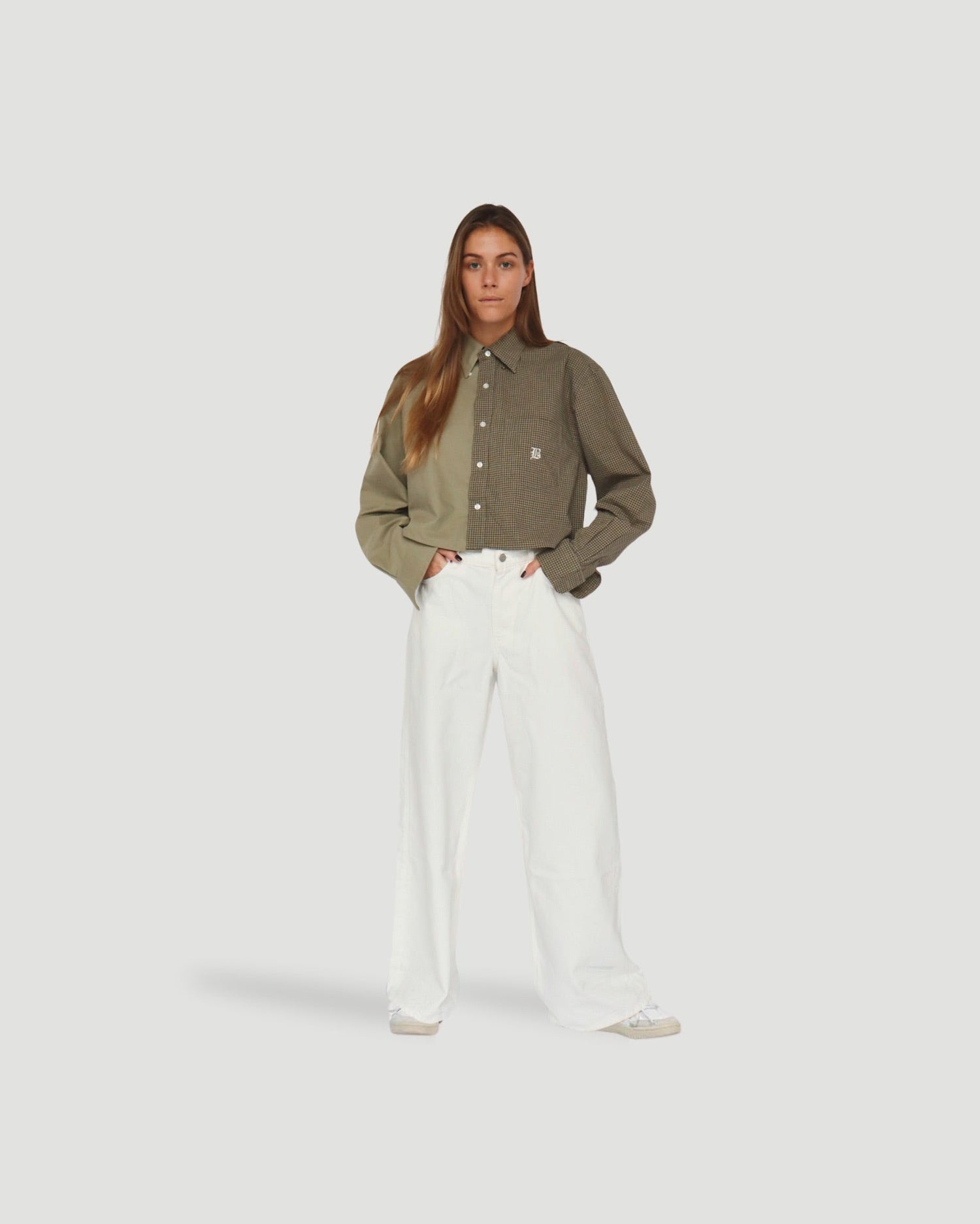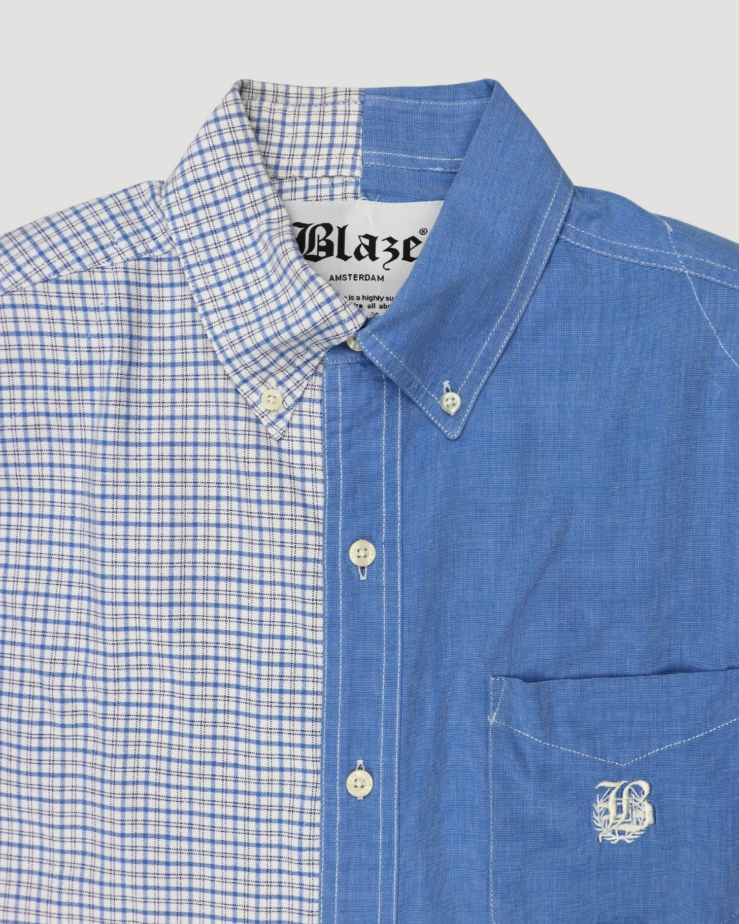 Introducing our Duo Shirt – a modern twist on a classic favorite. This unique piece is crafted from two vintage shirts, featuring added shoulder padding, embroidered B-logo and cropped length.