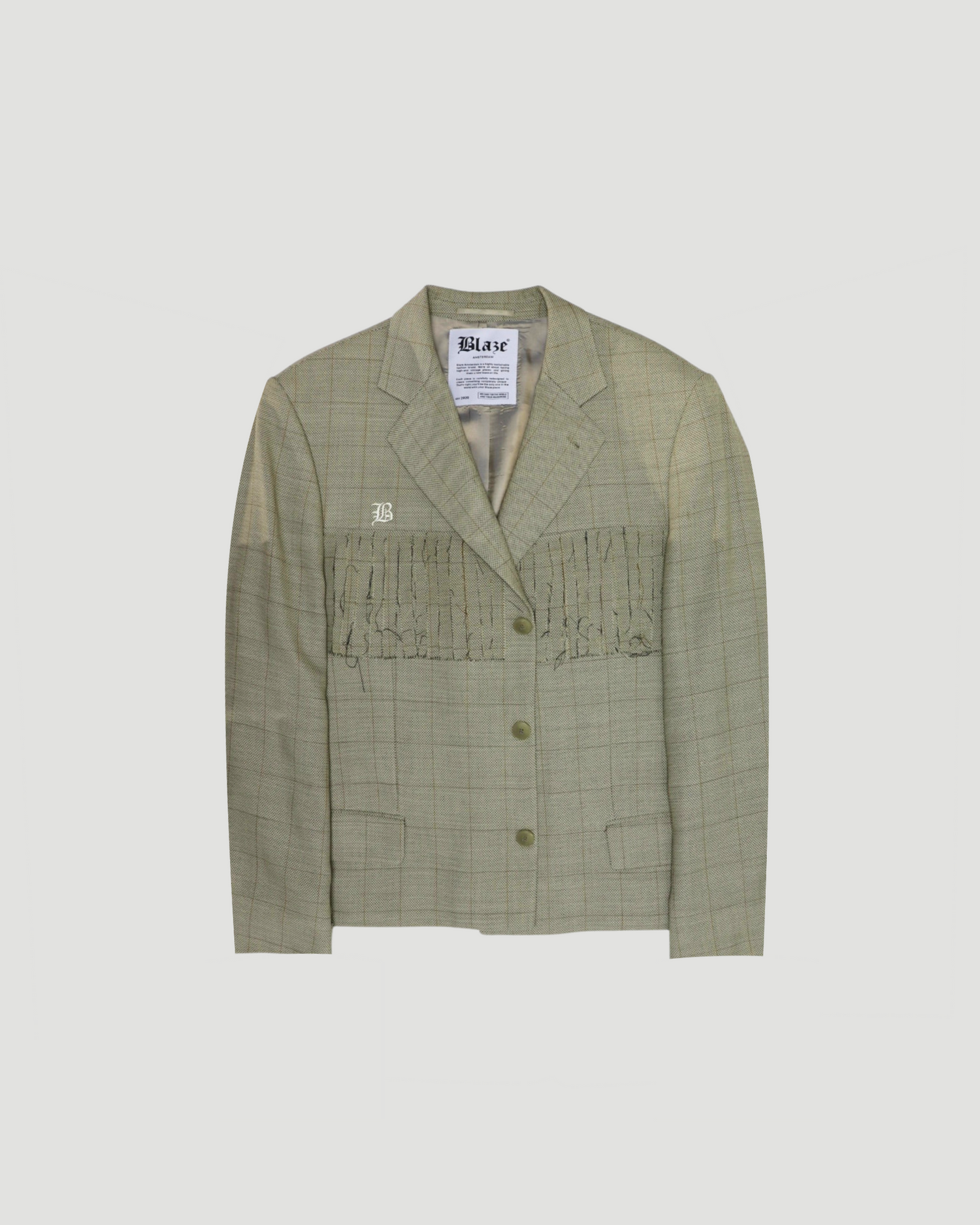 A playful short-fit blazer adorned with delicate fringes on the front panel and sleeves. This design adds movement and texture, giving a fresh, dynamic twist to classic tailoring.