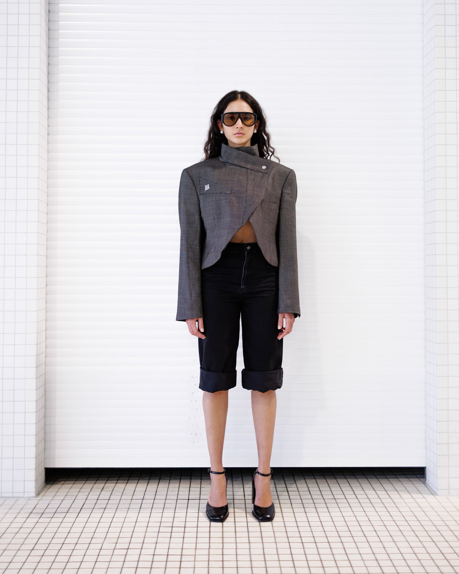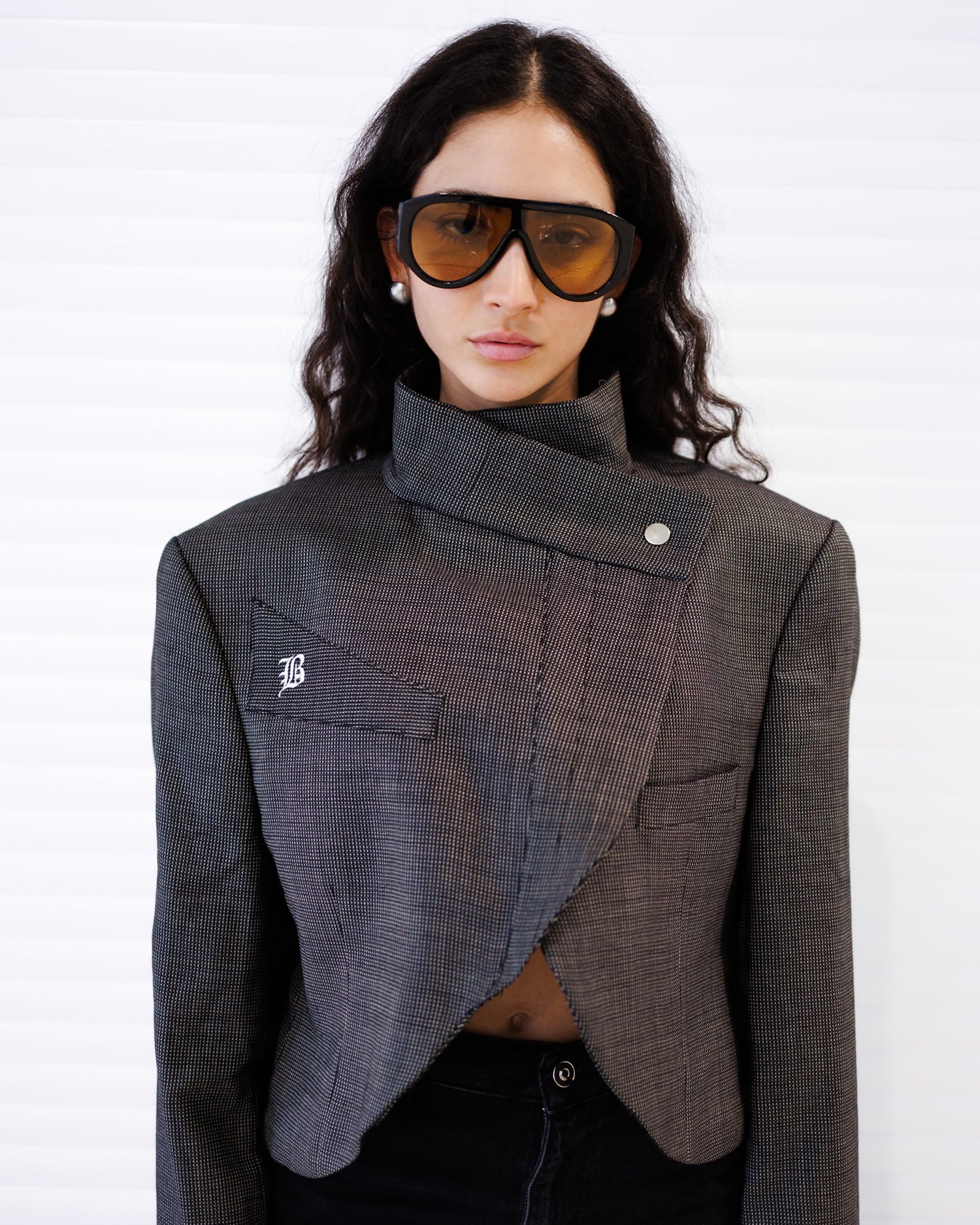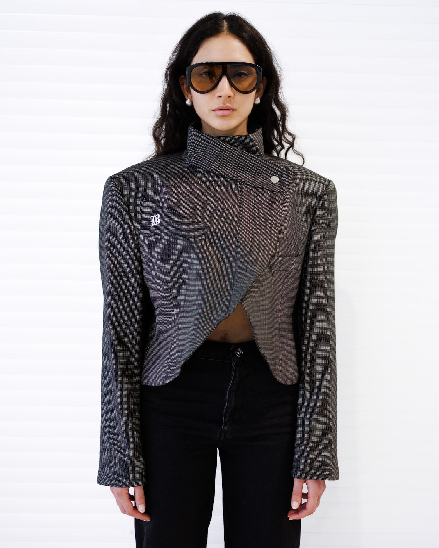 The Harness Blaze is inspired by the strength and contour of a harness. Designed with an asymmetrical closure and a single button at the top, it creates a striking, architectural silhouette. Bold, directional, and confidently modern.
