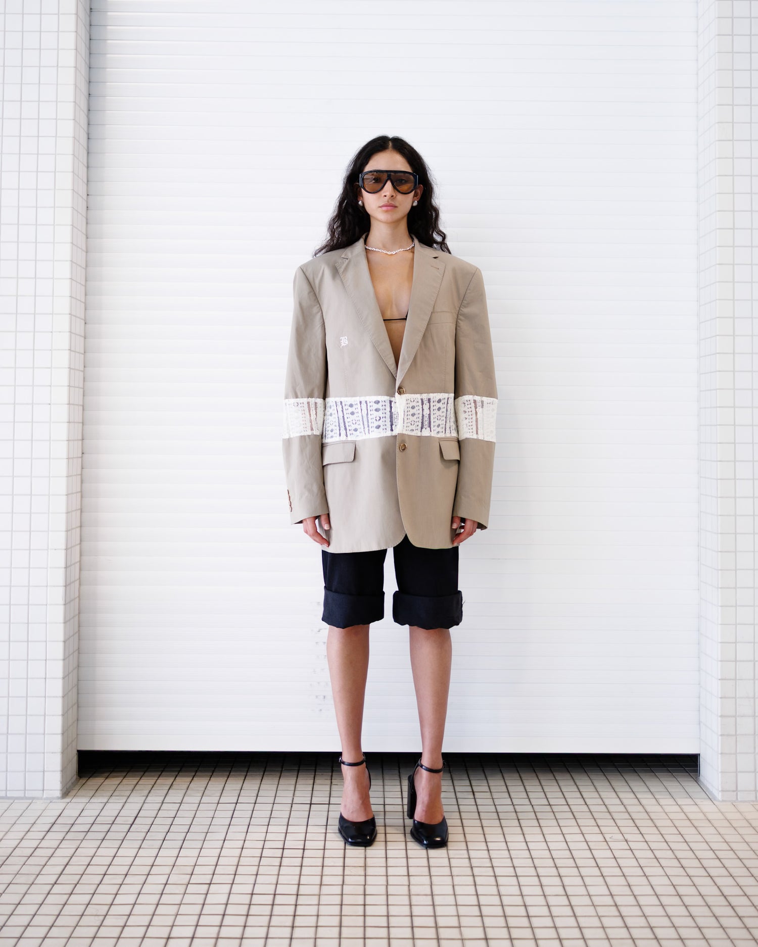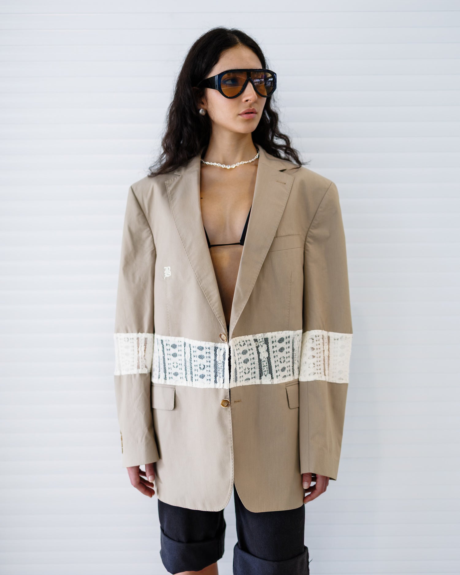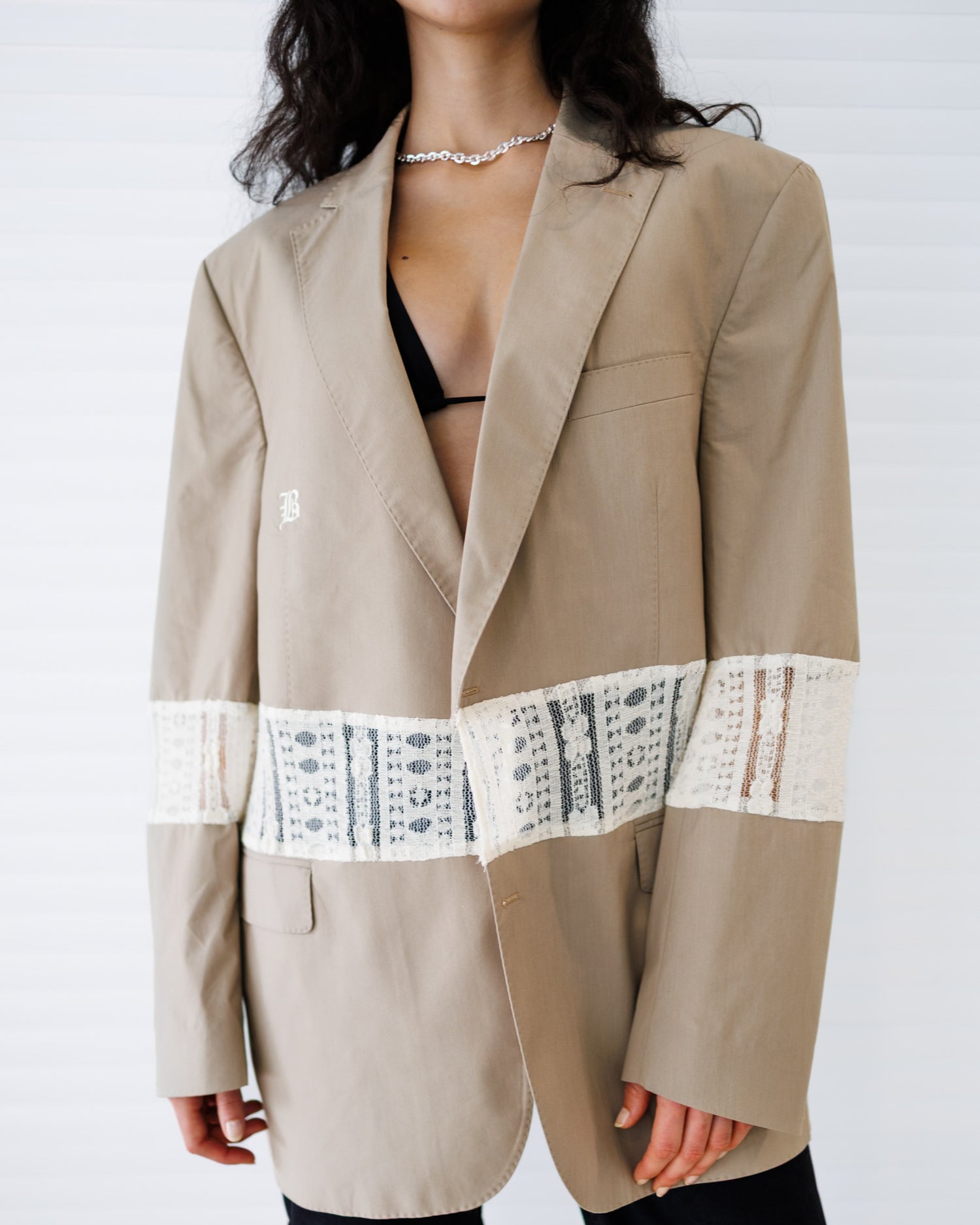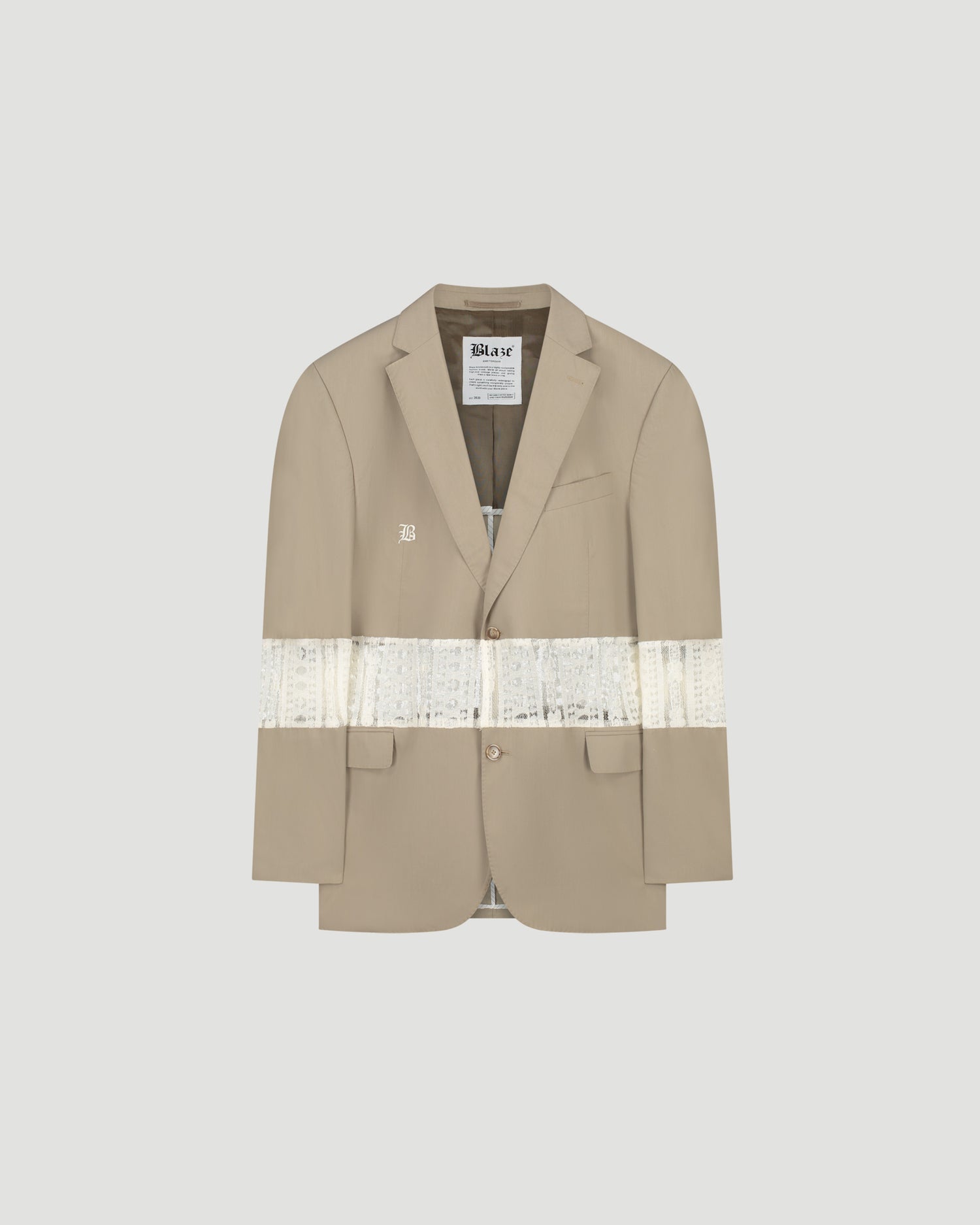 The Lace Blaze combines structure with romance. Divided through the centre with a panel of lace, it brings contrast, texture, and elegance to the blazer form. A statement piece that blends tailoring with delicacy.