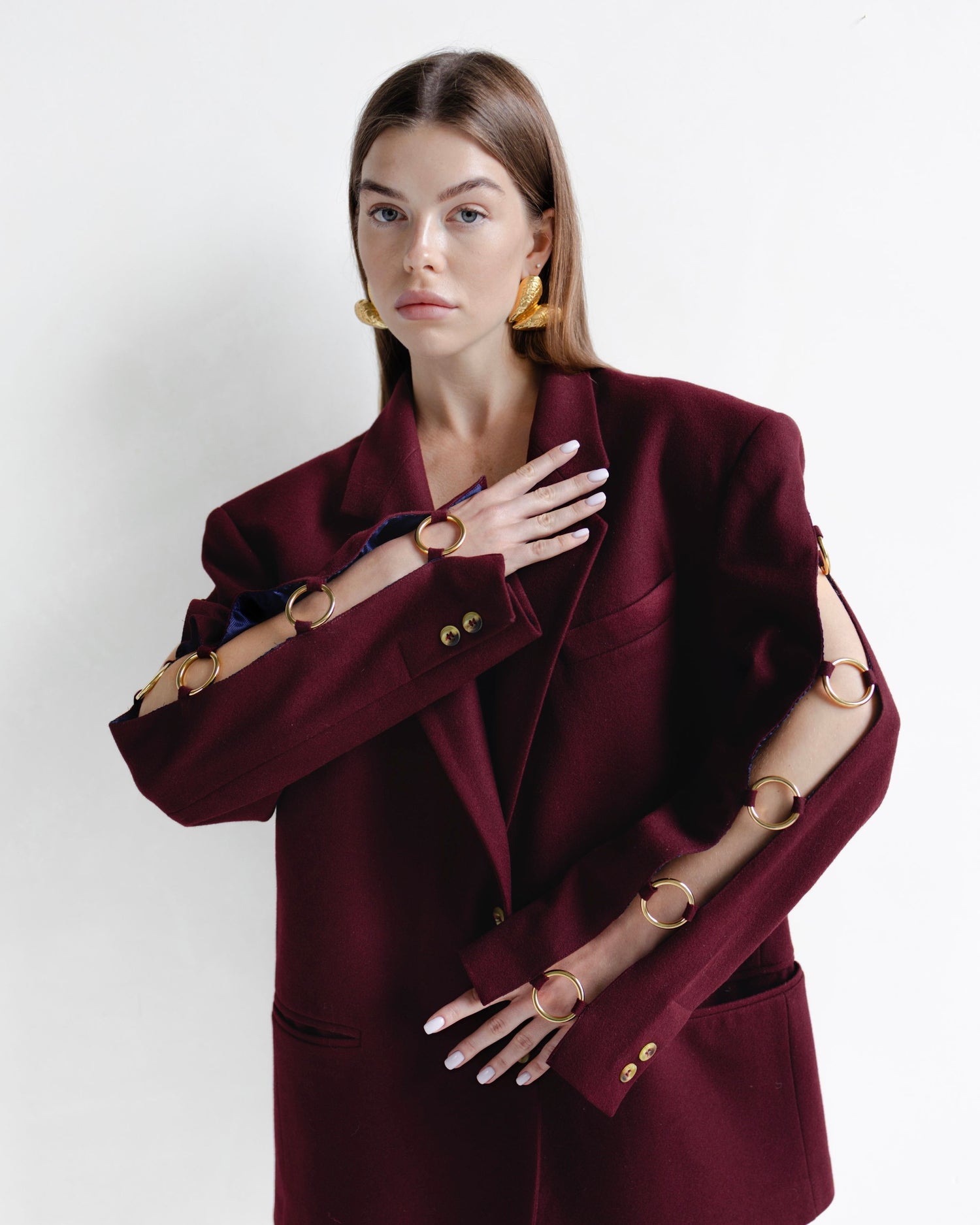 A chic tailored blazer with elegant golden rings subtly woven into the sleeves. The refined details give it a luxurious touch, perfect for an evening out or a festive dinner. Pair it with sleek trousers or a silky skirt for a look that’s effortlessly sophisticated and unique.