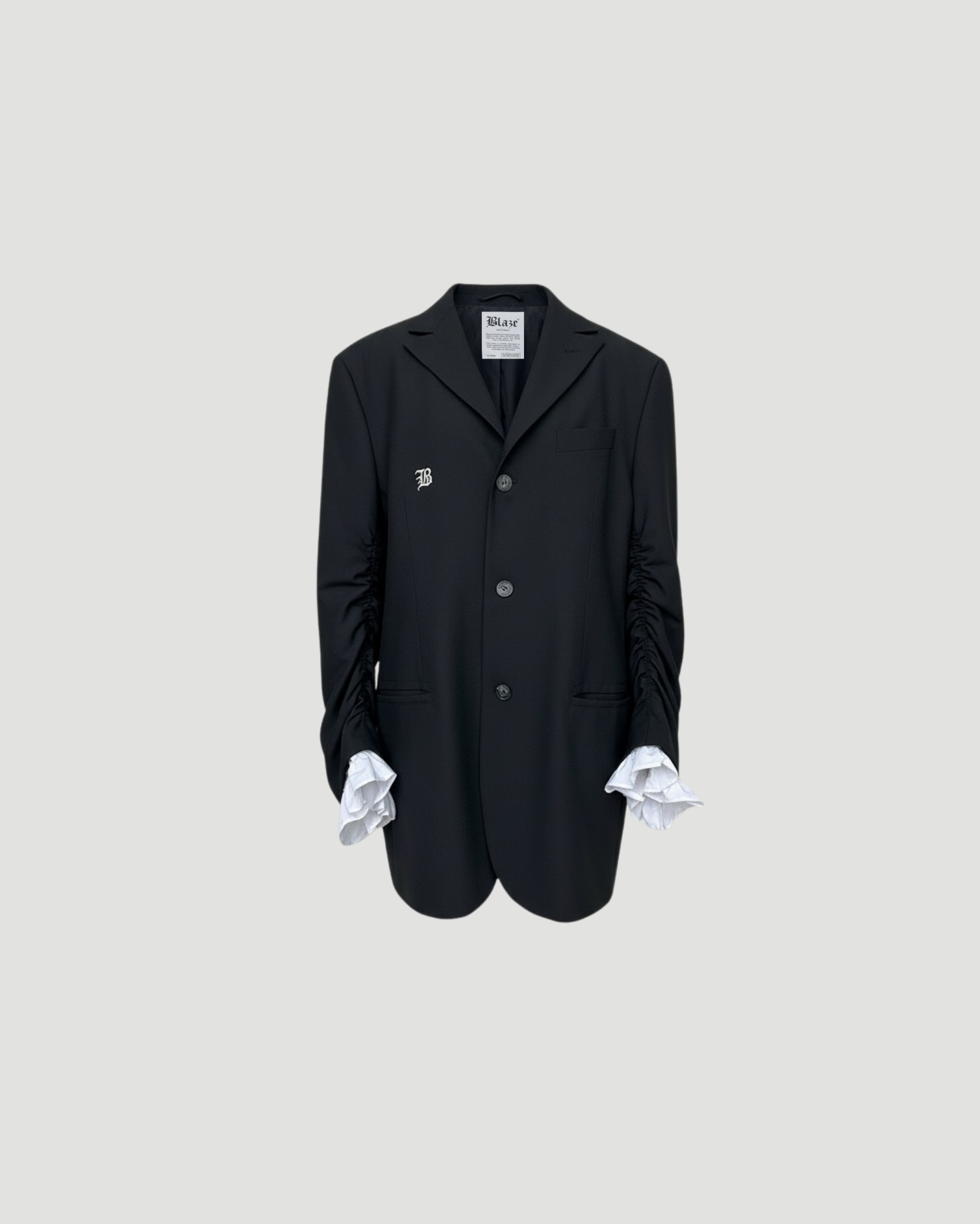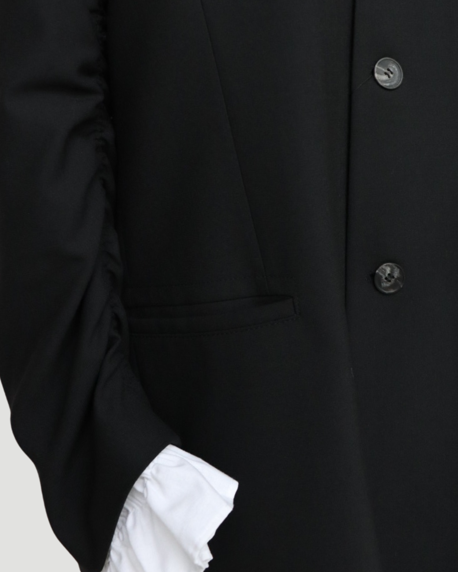 A tailored blazer with detachable ruffles at the ends of the sleeves. The ruffles can be removed to wash.