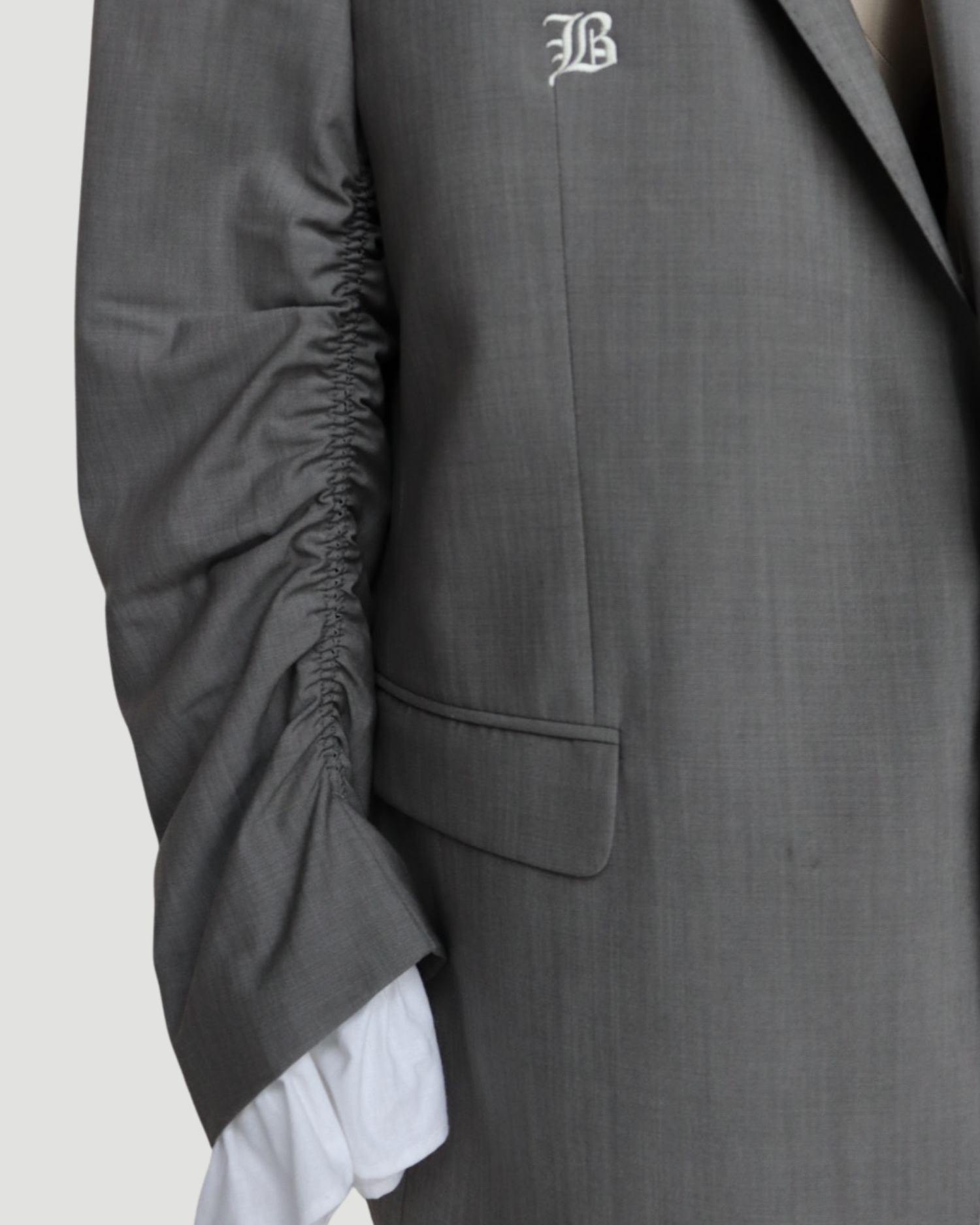 A tailored blazer with detachable ruffles at the ends of the sleeves. The ruffles can be removed to wash.