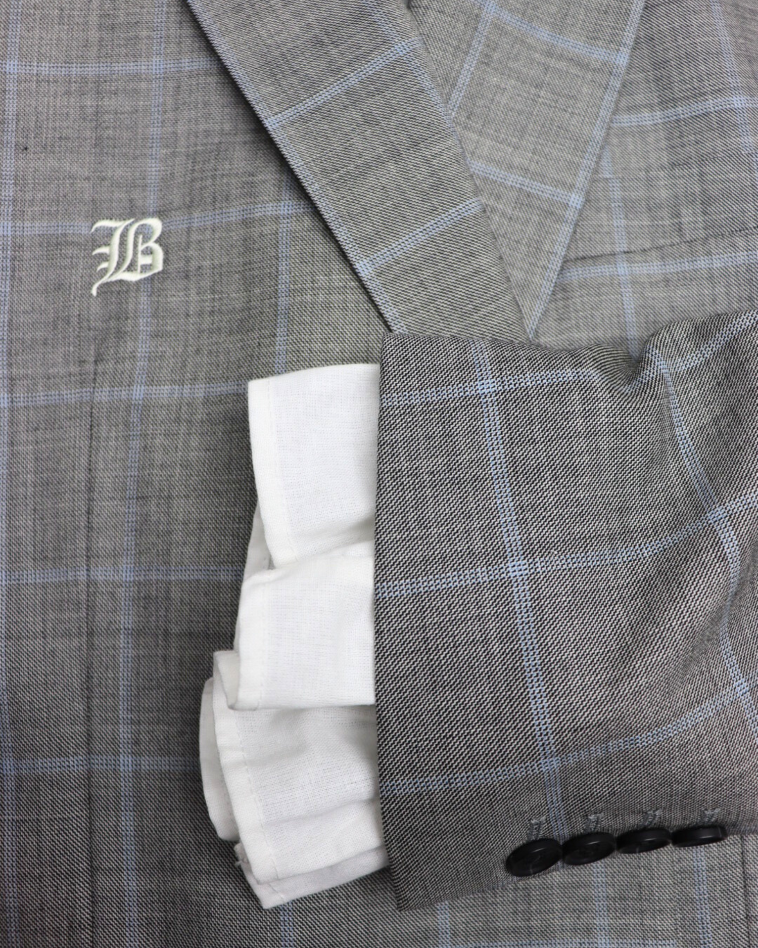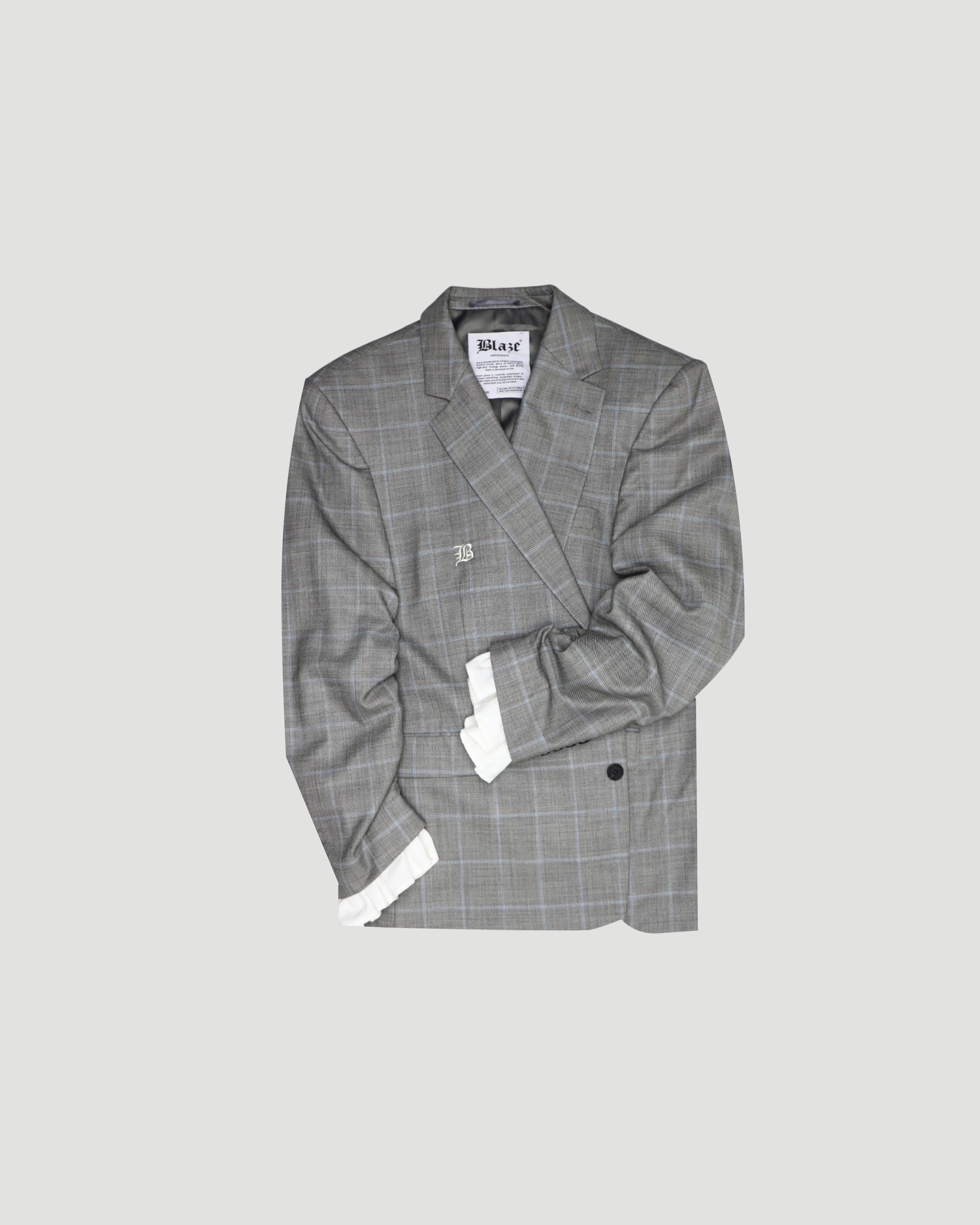 A tailored blazer with detachable ruffles at the ends of the sleeves. The ruffles can be removed to wash.