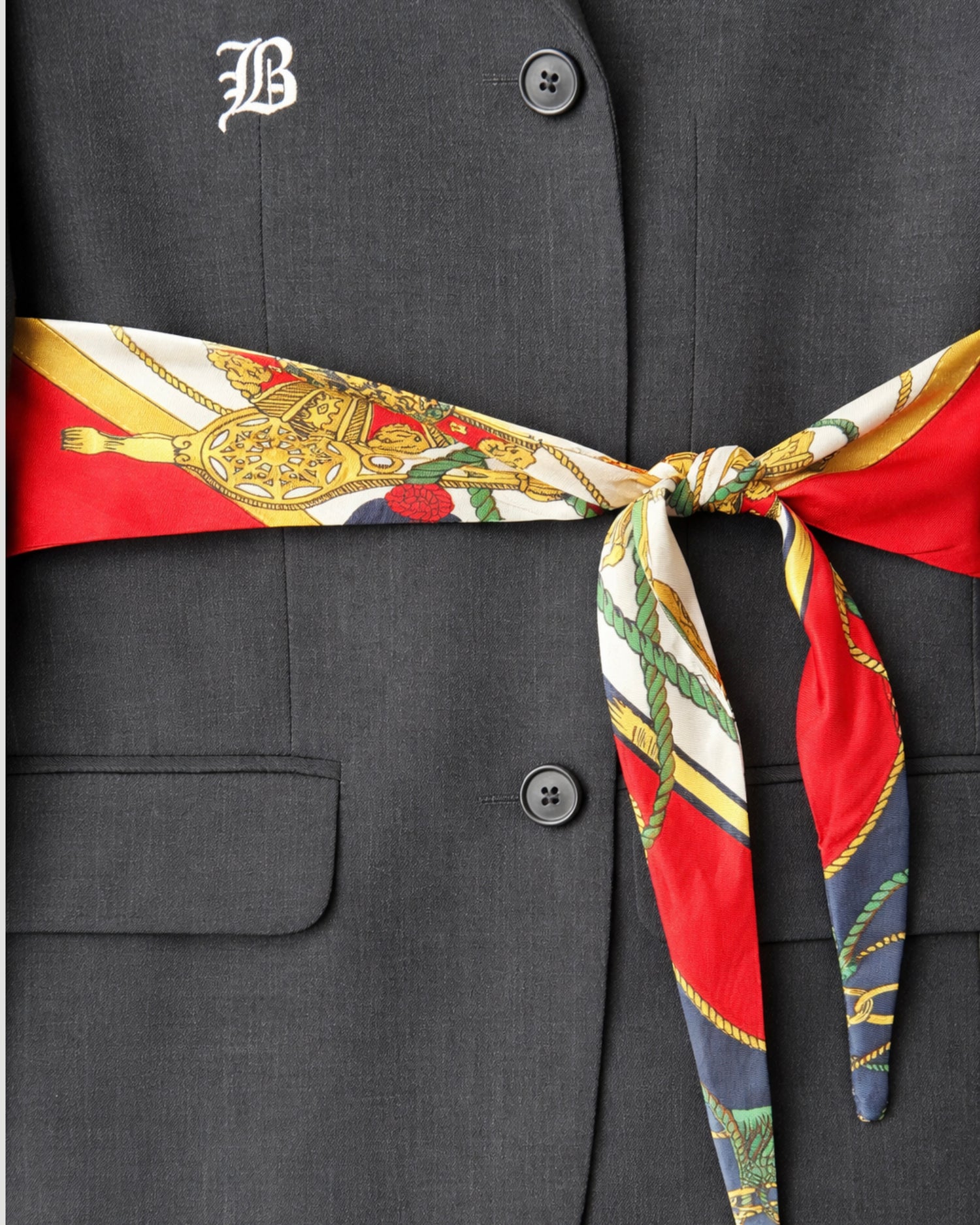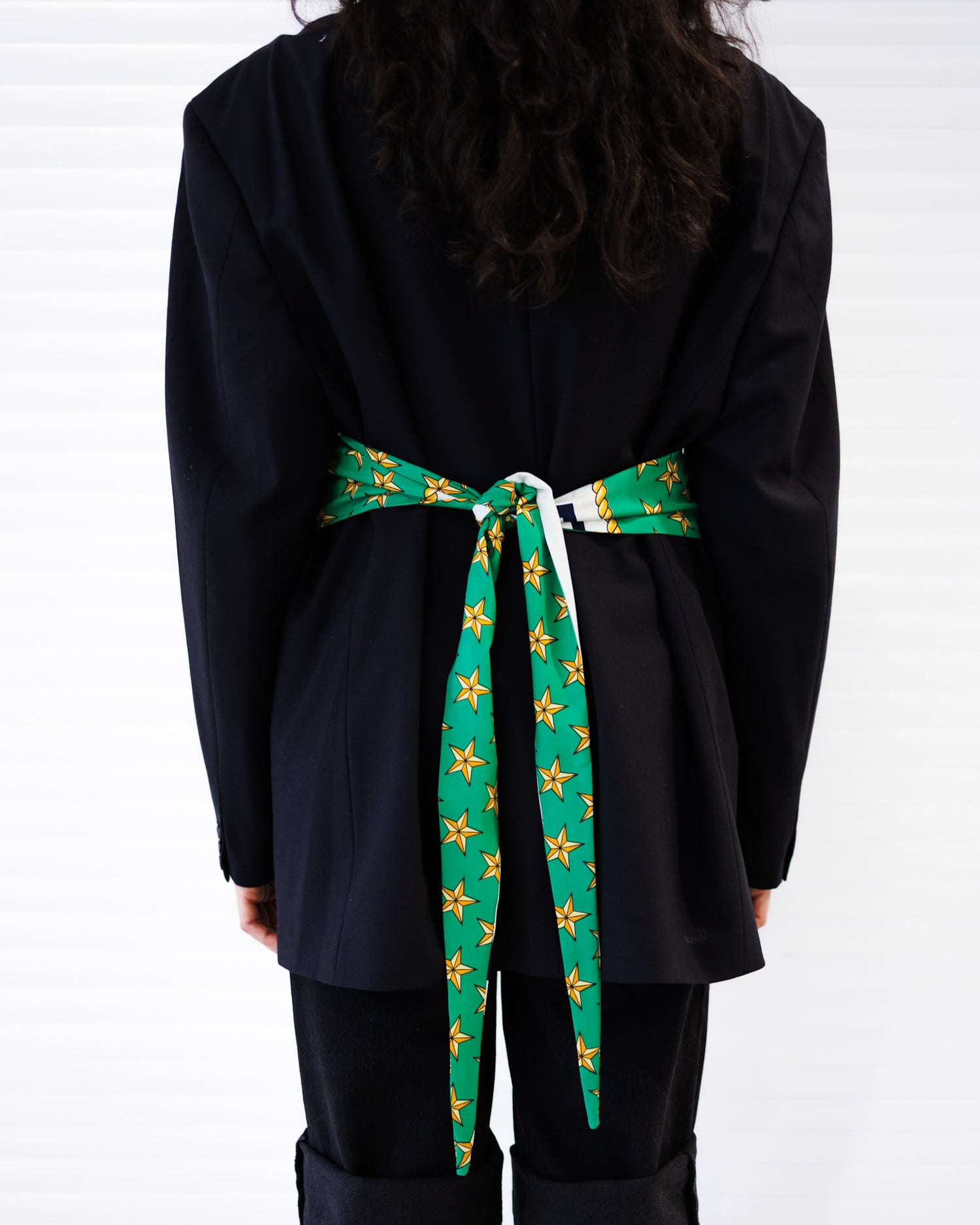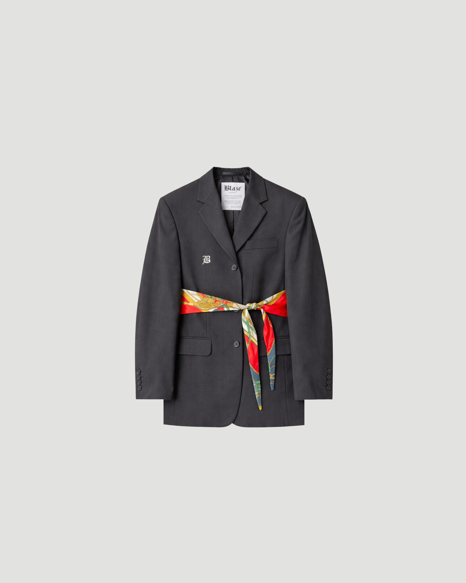 This unique Scarf Blaze is a reimagined classic, brought to life with a carefully selected vintage scarf. The scarf can be tied in two different ways, loosely draped across the front for an effortlessly angled look, or wrapped around the back to sculpt a beautifully defined silhouette.