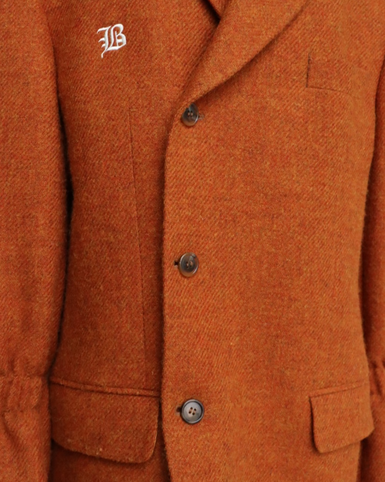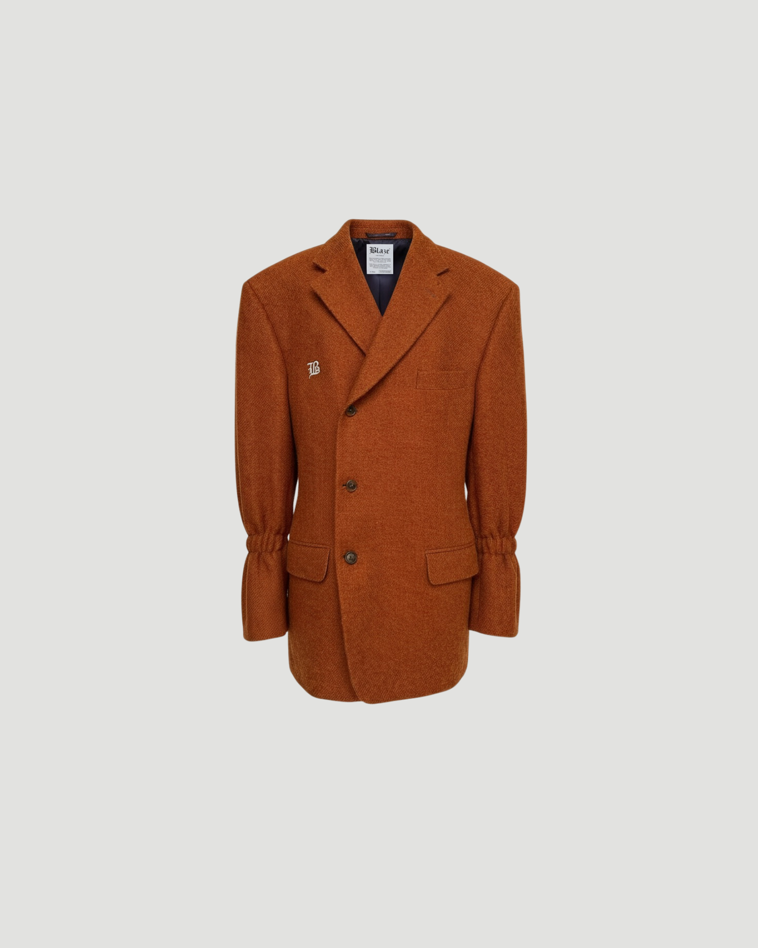 This scrunched-sleeve blazer wraps asymmetrically across the front, fastening off-center for sleek, tailored fit. Its flared cuffs give it a a powerful and precise in its movement.