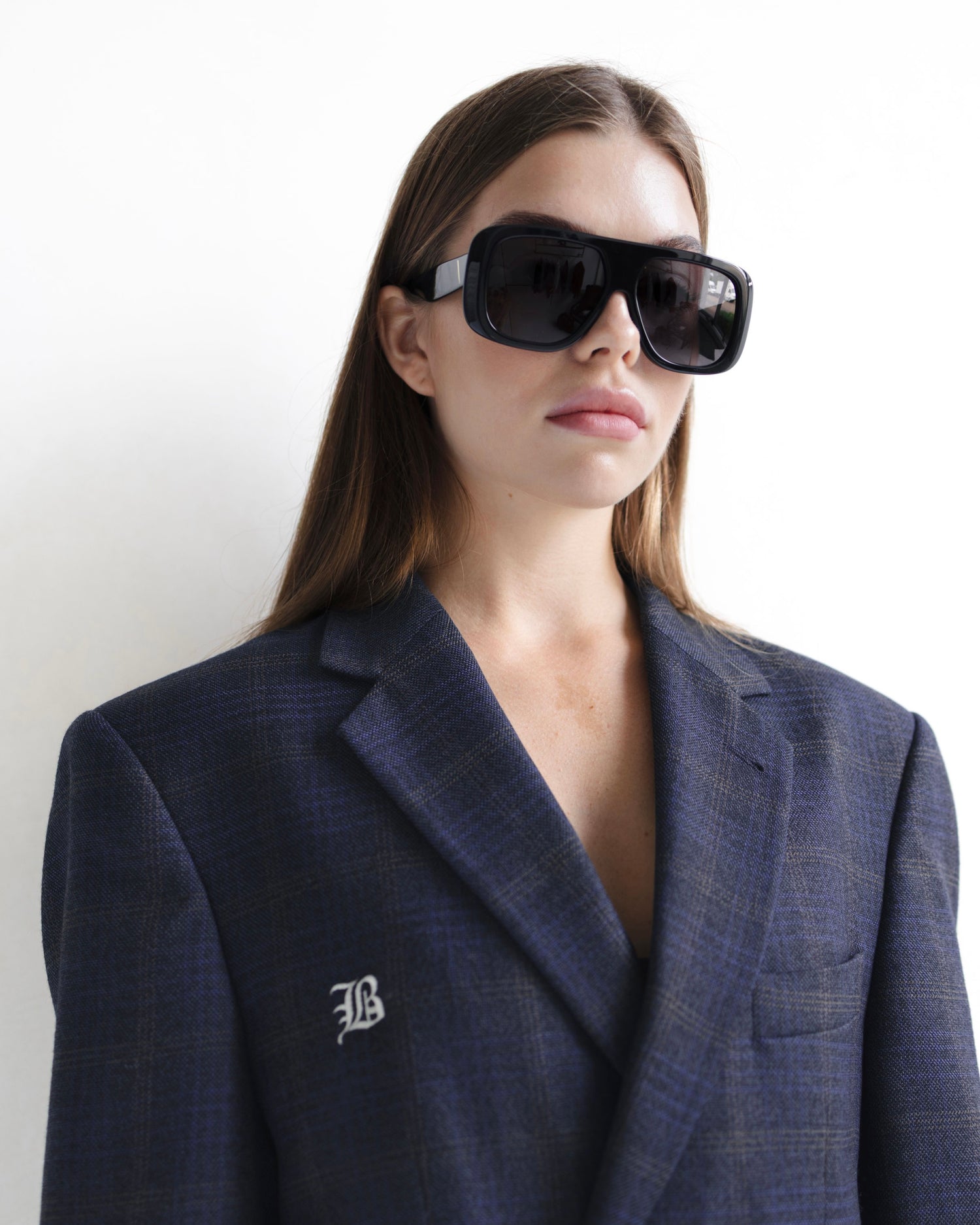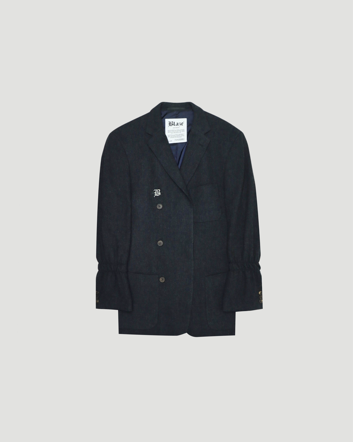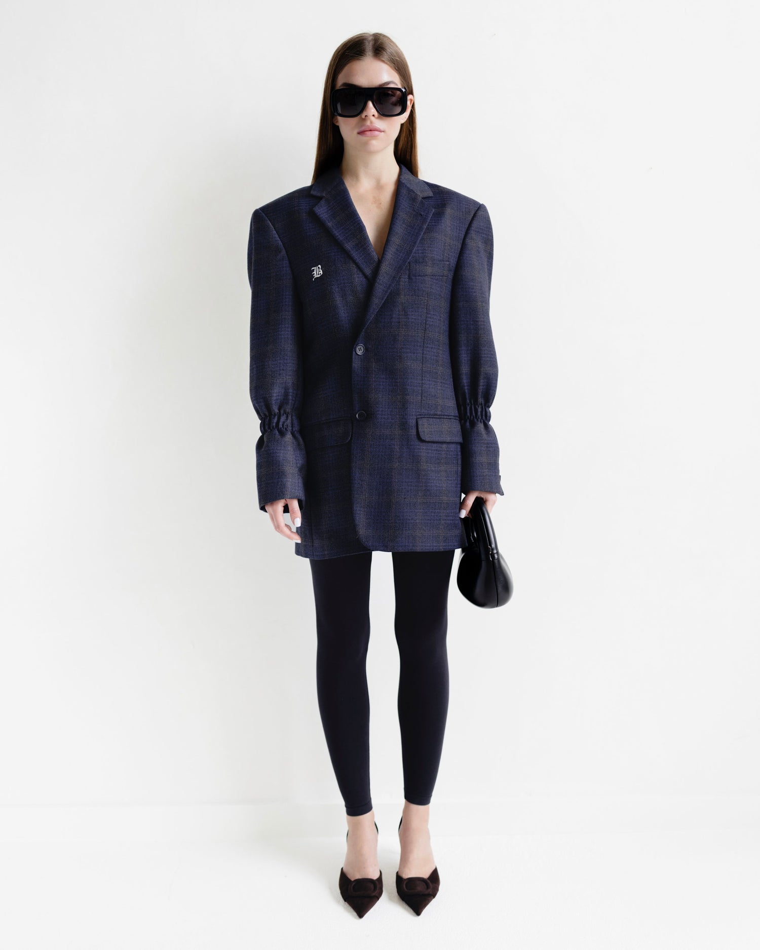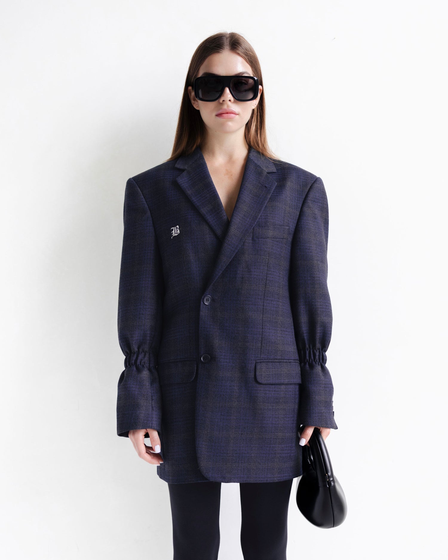 This scrunched-sleeve blazer wraps asymmetrically across the front, fastening off-center for sleek, tailored fit. Its flared cuffs give it a a powerful and precise in its movement.