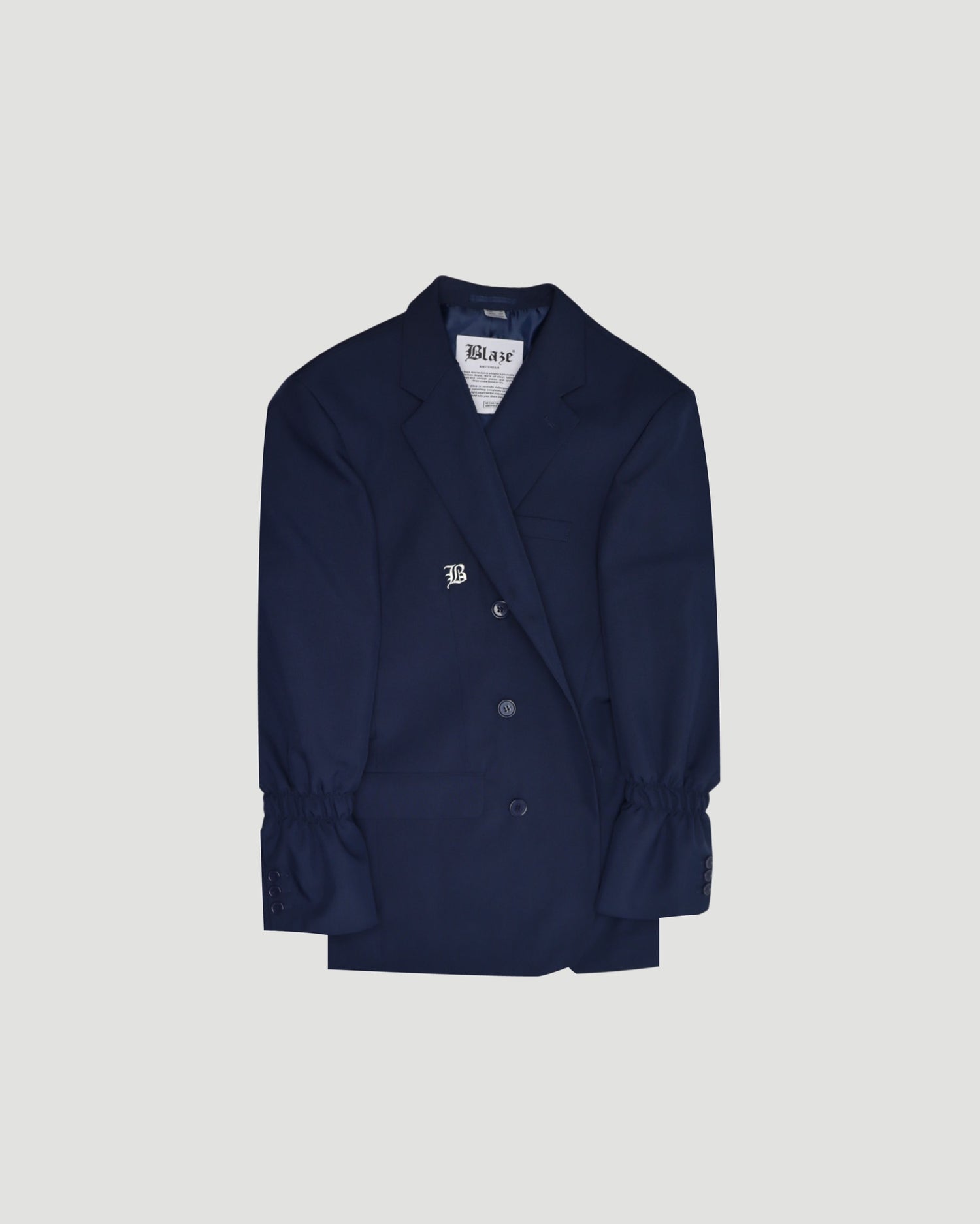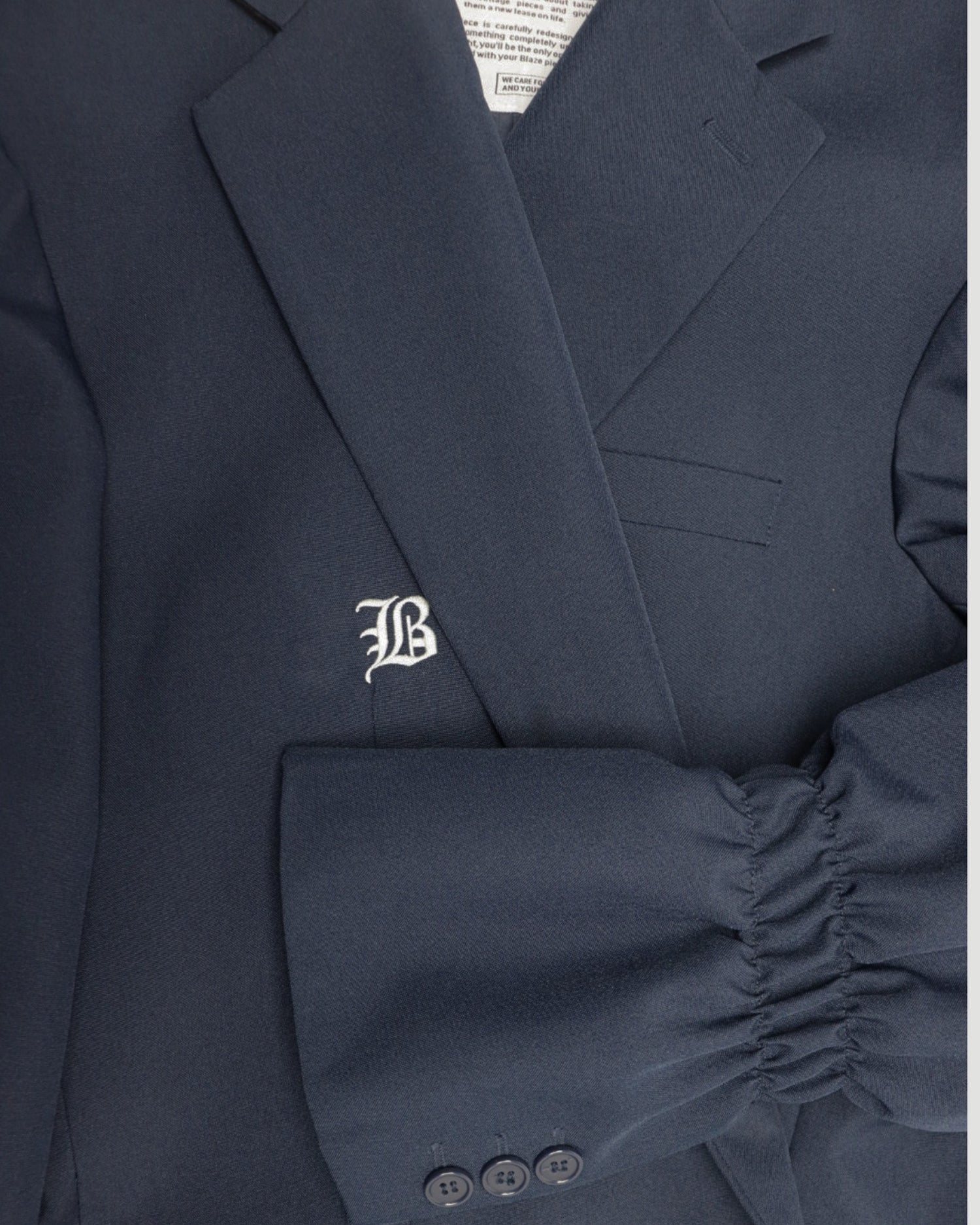 This scrunched-sleeve blazer wraps asymmetrically across the front, fastening off-center for sleek, tailored fit. Its flared cuffs give it a a powerful and precise in its movement.