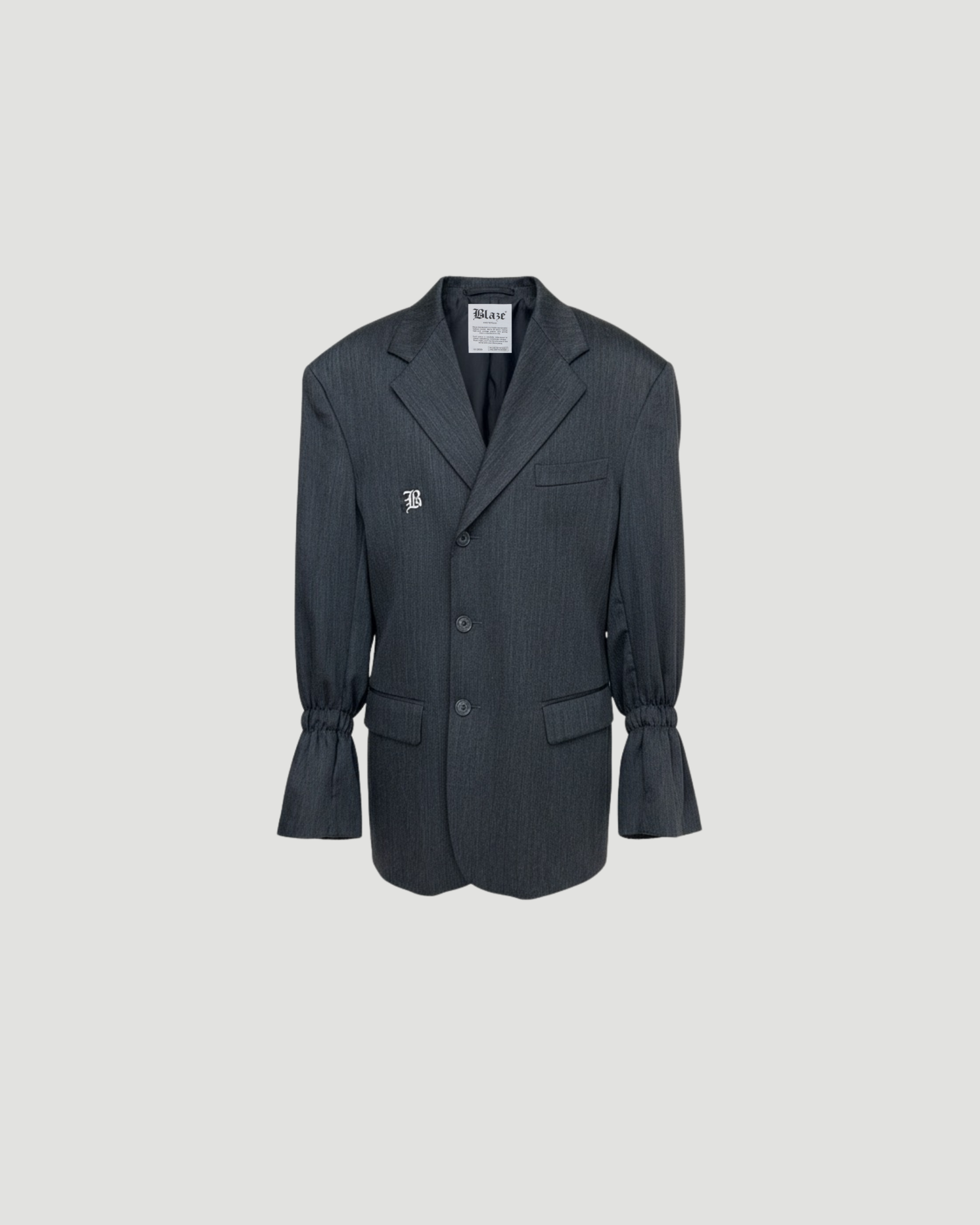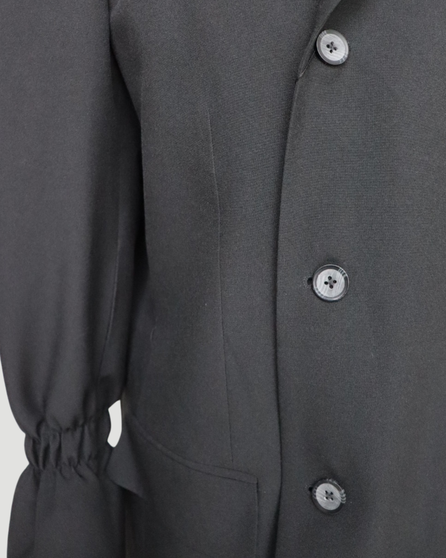 This scrunched-sleeve blazer wraps asymmetrically across the front, fastening off-center for sleek, tailored fit. Its flared cuffs give it a a powerful and precise in its movement.