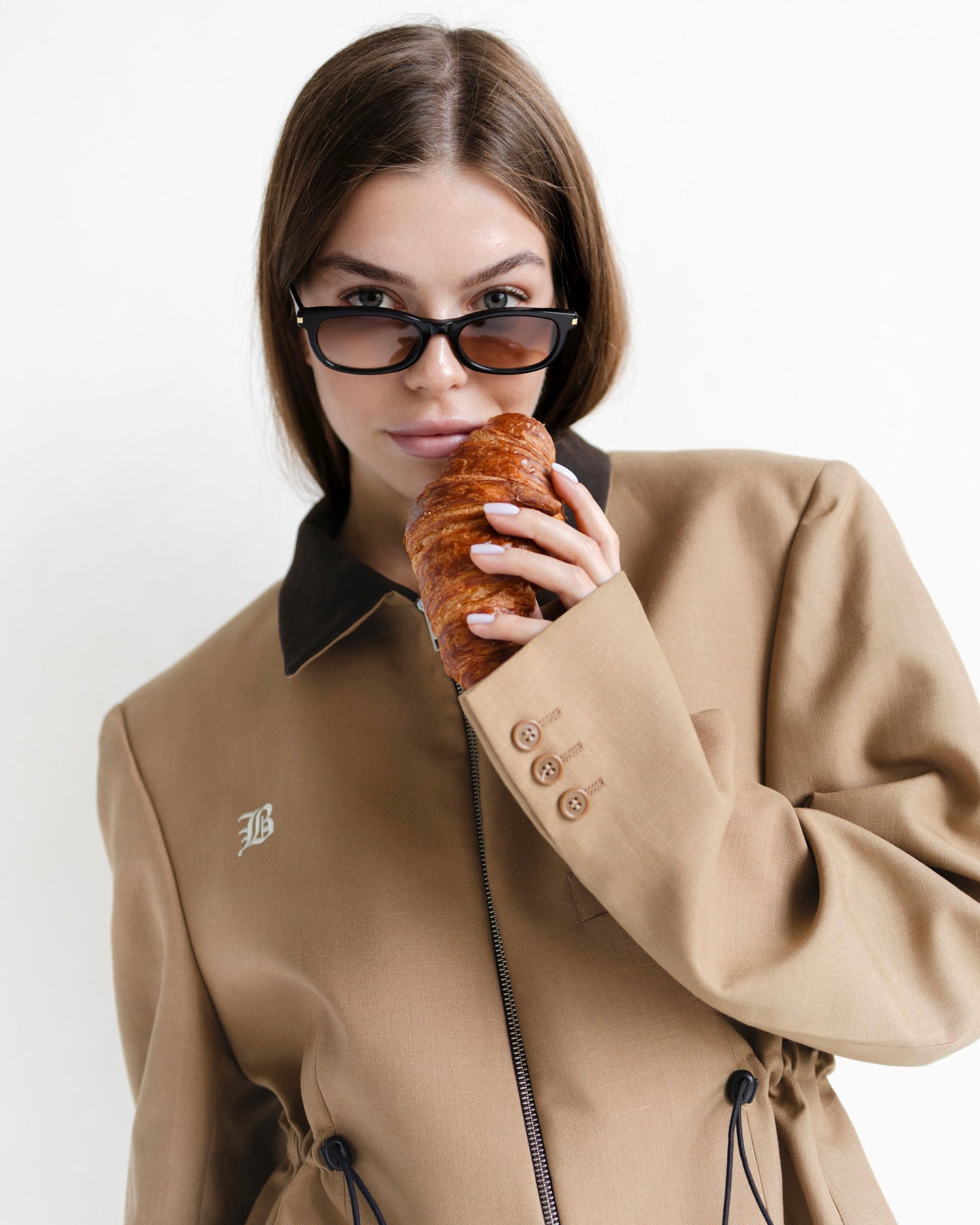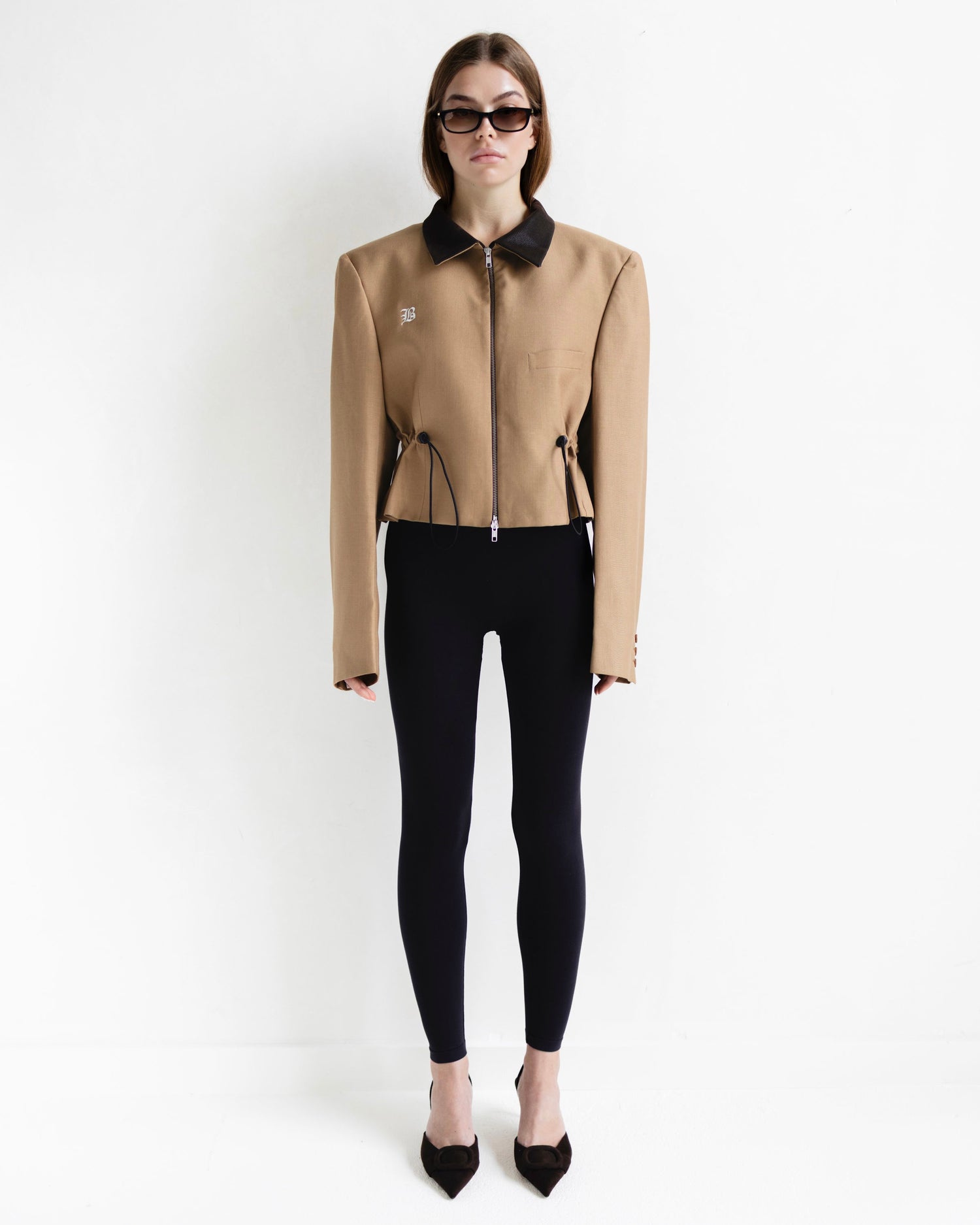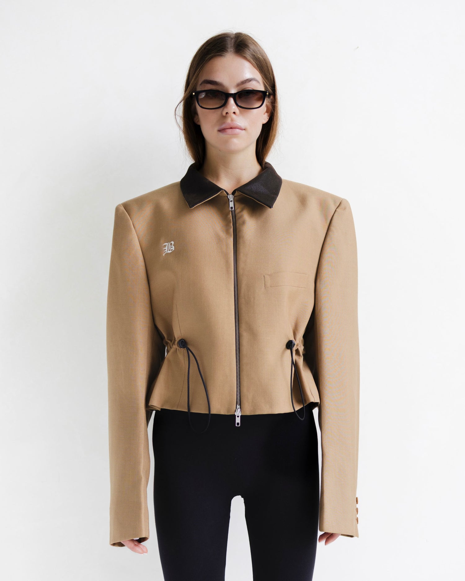A structured blazer with a zip and tailored waist. A collar made from dark brown faux suede-like material, with adjustable waist detail for a cinched shape.