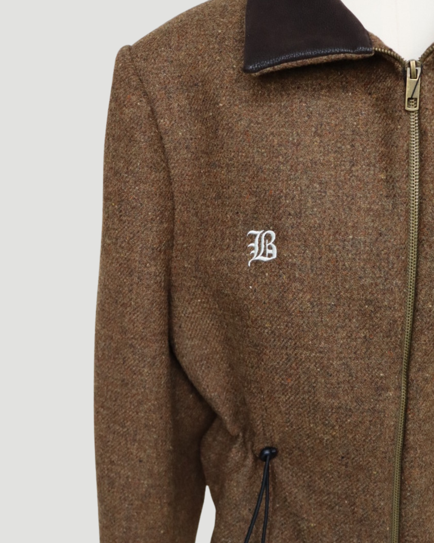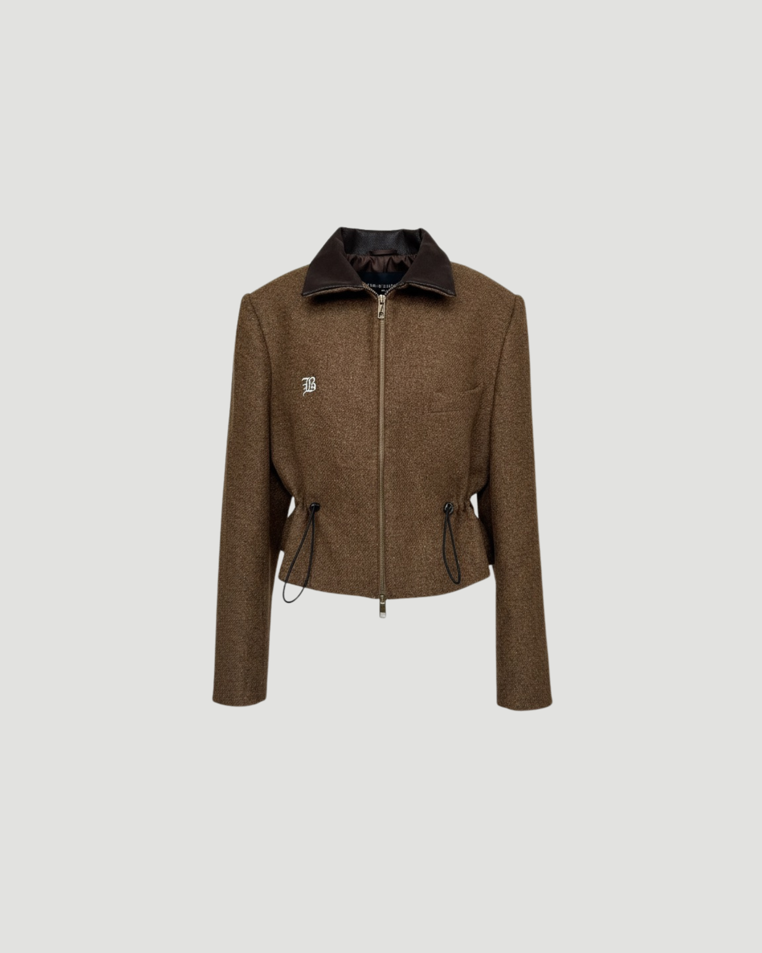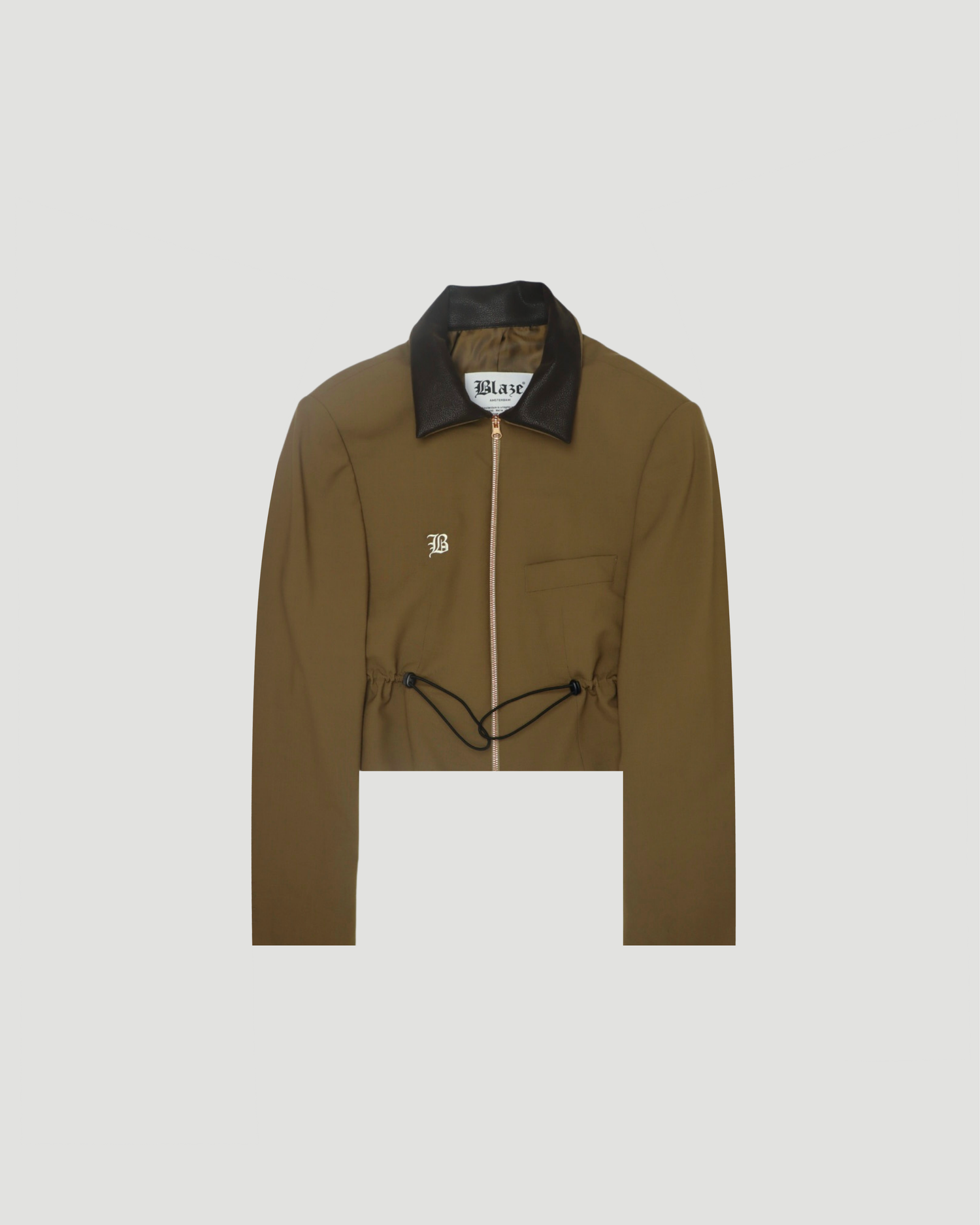 A structured blazer with a zip and tailored waist. A collar made from dark brown faux suede-like material, with adjustable waist detail for a cinched shape.