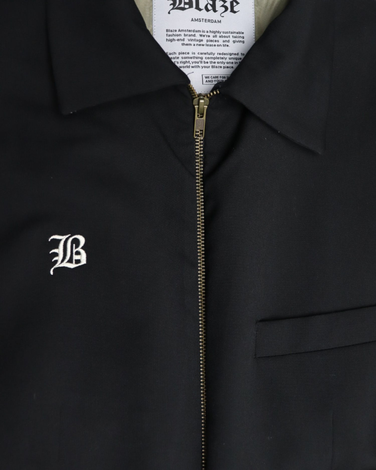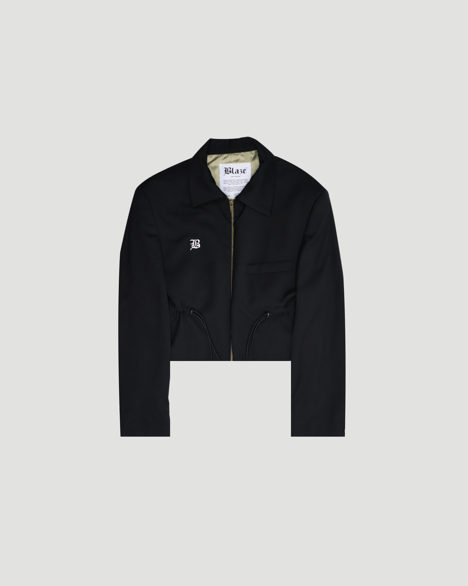 A structured blazer with a zip and tailored waist. A collar made from dark brown faux suede-like material, with adjustable waist detail for a cinched shape.